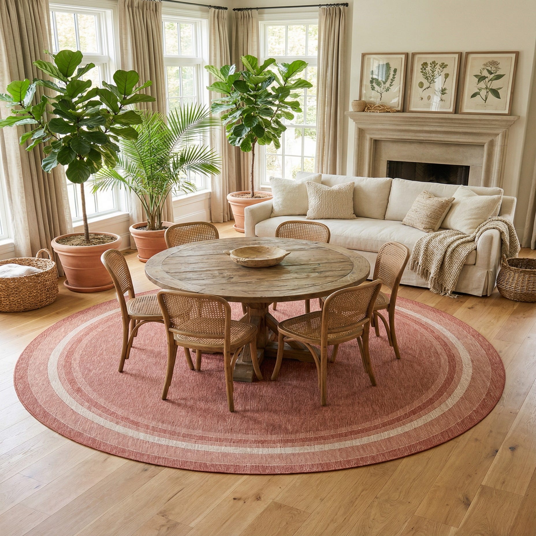 Grounded in a warm rust red field, this round rug features a simple, elegant border of concentric bands in coordinating rust tones and ivory. The pattern is clean and restrained, a modern-traditional look that brings structure without overpowering a space. Machine-made of 100% polypropylene, the surface is low-profile and flatwoven with a subtle texture you can feel underfoot — smooth with a gentle rib that complements both indoor and outdoor settings.