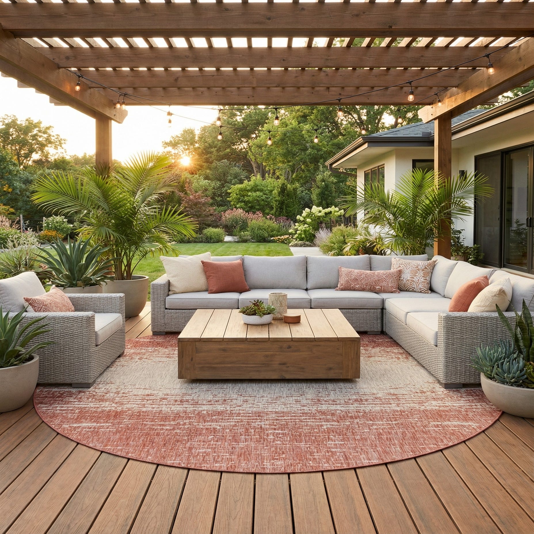 This rug works well on covered patios, under a round dining table, or in a sunroom as an anchor for relaxed seating. Pair it with natural woven furniture and neutral cushions for a casual, modern outdoor look, or place it beneath metal-framed chairs and concrete planters to balance contemporary materials with warm color. The rust and gray palette complements warm woods and cool grays alike, making it easy to layer into both modern and transitional décor schemes.