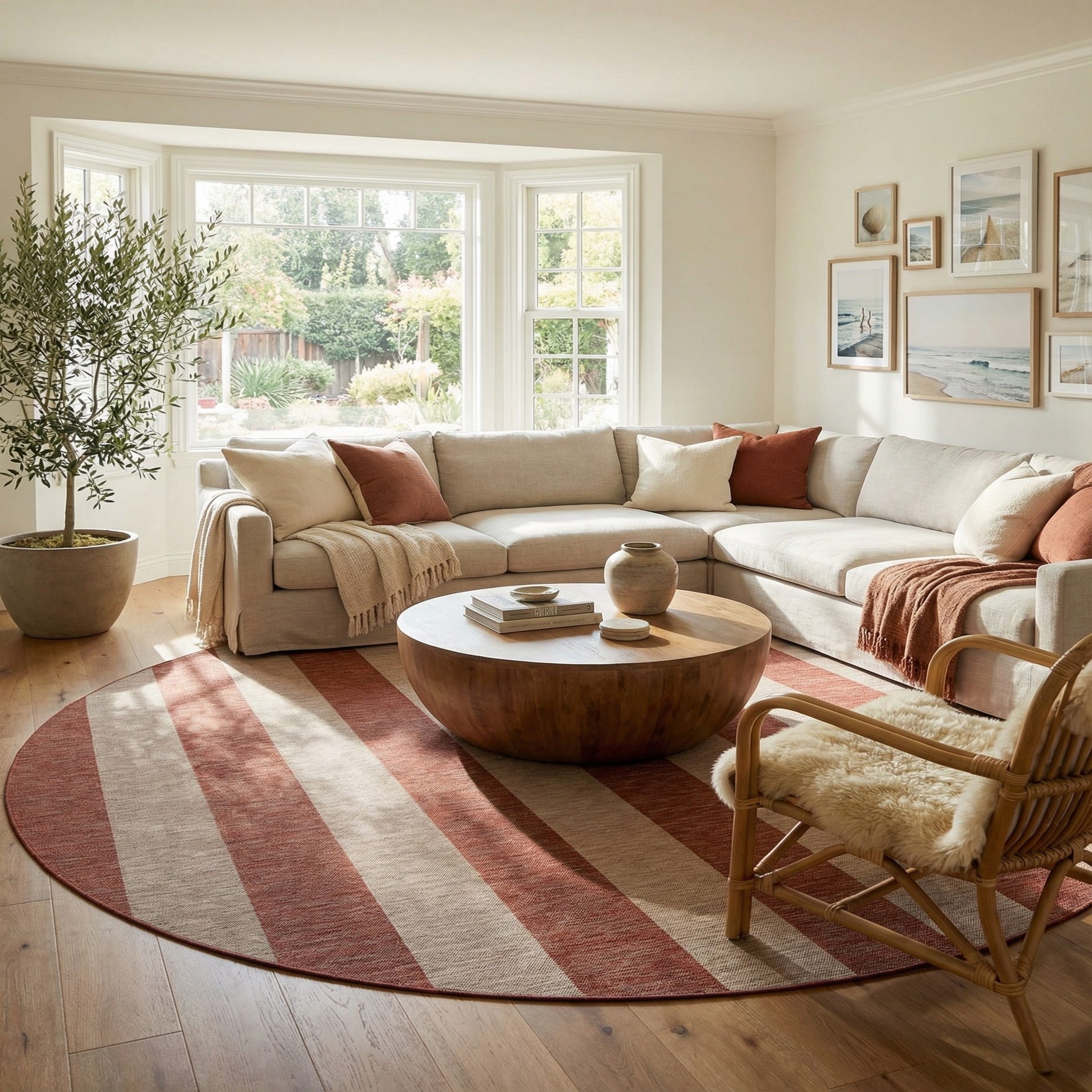 This piece works well in casual, transitional settings — place it beneath a round dining table on a covered patio, anchor a conversation area on a screened porch, or layer it in a sunroom to bring warmth to wicker and wood furnishings. The rust-red ground pairs beautifully with natural woods and warm metals, while the gray stripes coordinate with charcoal or navy accents for a balanced, grounded look.