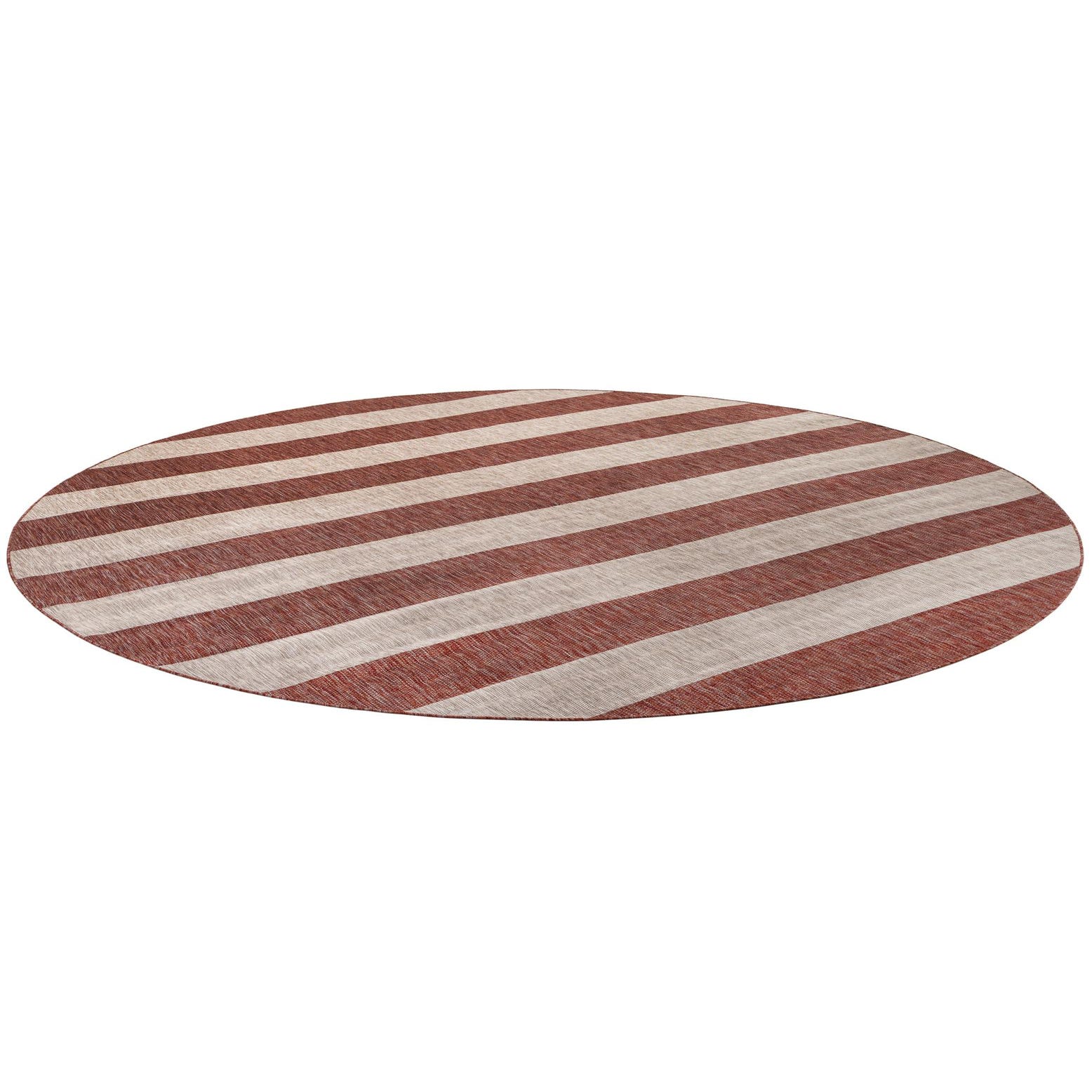 Broad, horizontal ribbon stripes cross the round surface in a straightforward, modern pattern. A warm rust-red background alternates with soft gray bands, each stripe showing a subtle, heathered texture that adds visual depth without extra pile. Machine made from 100% polypropylene, the rug has a low-profile, tightly woven face that feels firm underfoot and holds its shape.