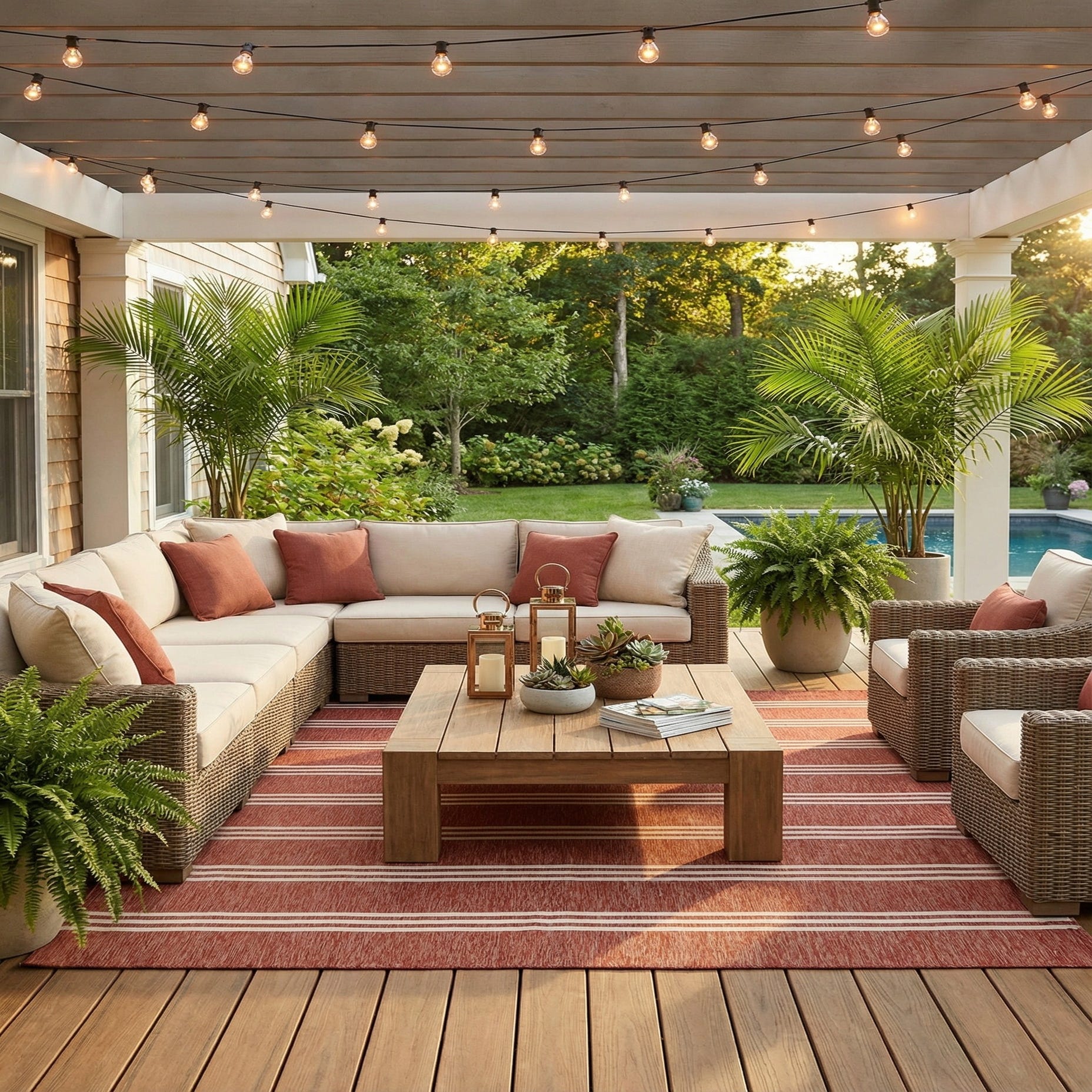 The warm rust and ivory palette pairs naturally with weathered woods, rattan, or painted white furniture, making it a strong choice for covered patios, sunrooms, or casual dining areas. Use it to anchor an outdoor seating group, add color to a deck, or bring a structured, contemporary stripe to a living area with neutral upholstery and simple accessories such as woven pillows and ceramic accents.