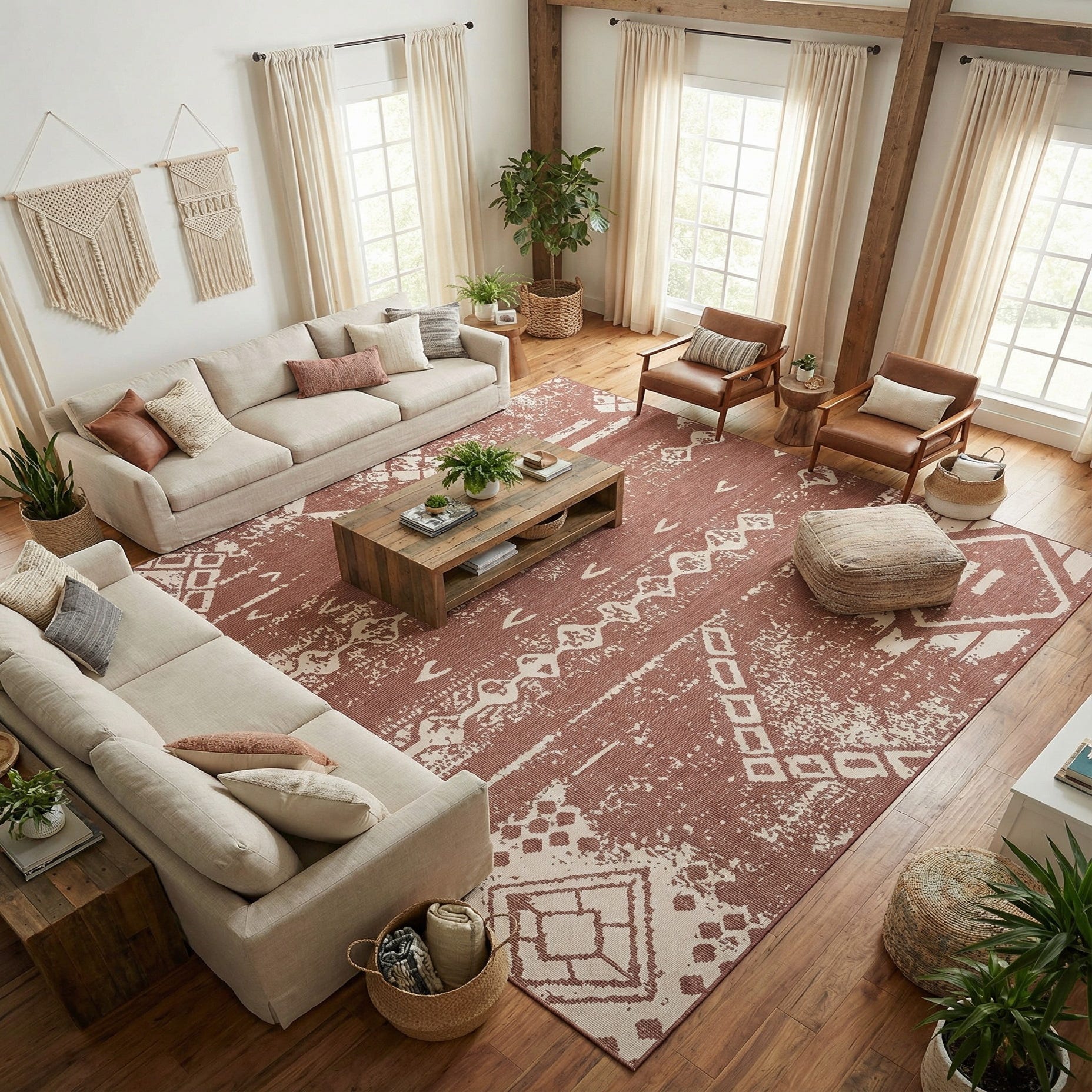 Machine-made from 100% polypropylene, the rug has a low-profile, flatwoven feel you can trace with your hand — firm underfoot with subtle surface variation. Its color palette and pattern work well on a covered patio or sunroom, beneath a rattan seating group, or under a dining table paired with reclaimed wood and linen upholstery. It also complements modern farmhouse and southwestern schemes, and layers nicely with neutral outdoor furniture and terracotta accents to bring warmth and pattern to casual living spaces.
