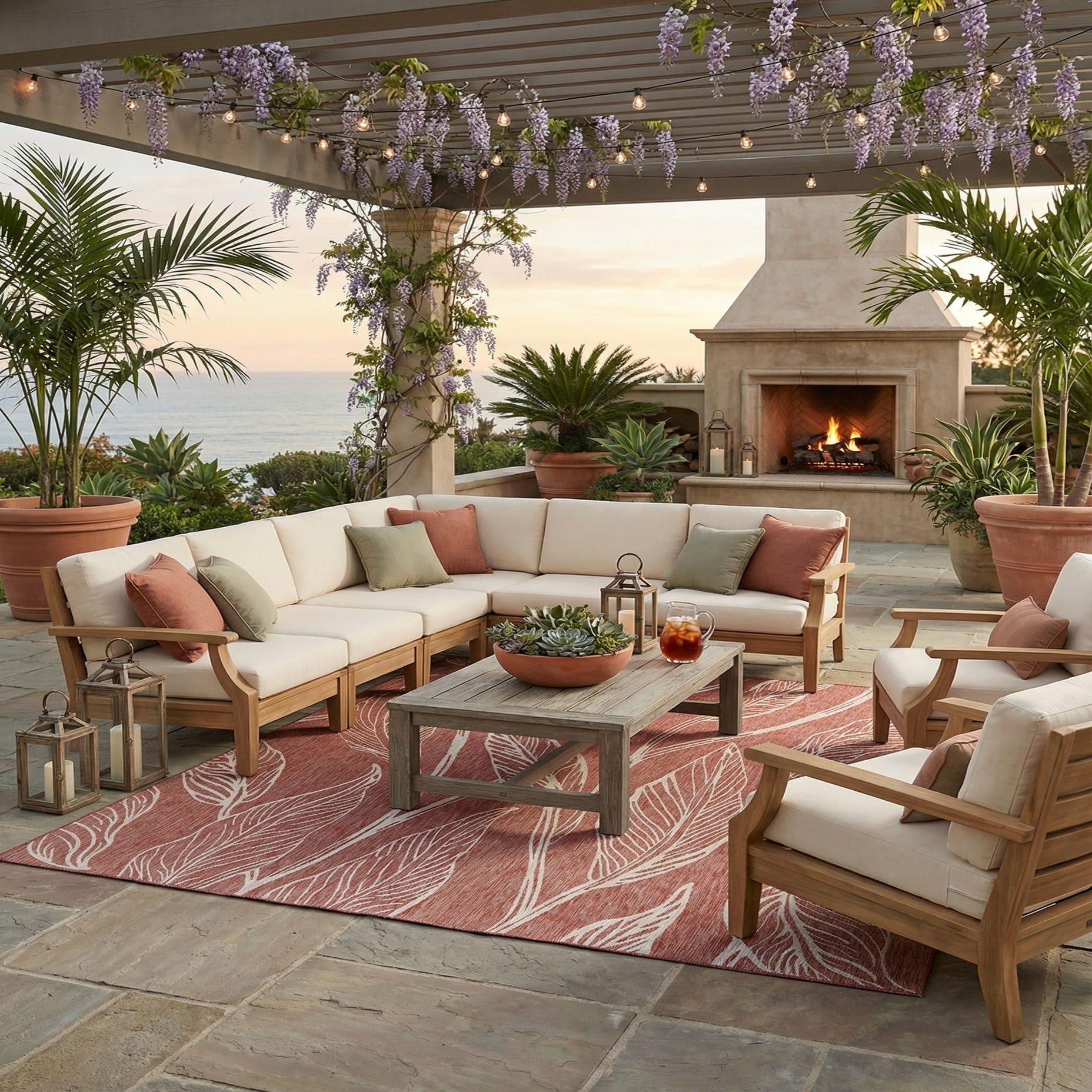 Works well as an anchor for a covered patio or sunroom, bringing warmth to outdoor seating areas and open-air dining spaces. Inside, pair it with warm wood furniture, neutral linen or gray upholstery, and metal accents for a modern farmhouse or transitional living room. Its rich rust tone and linear leaf pattern also complement woven textures and muted green or beige accessories for layered, cohesive styling.
