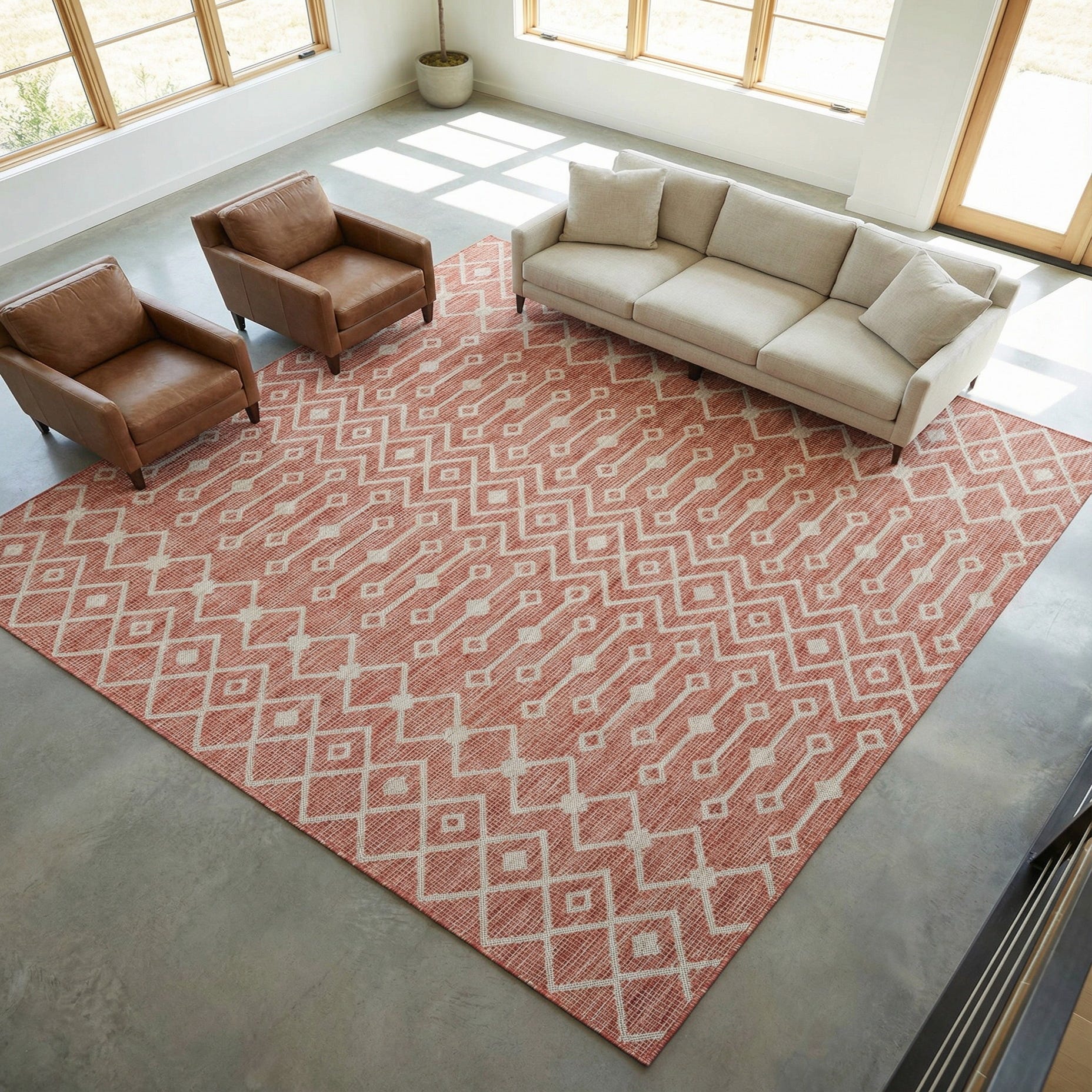 A warm rust red ground sets the stage for a linear geometric pattern of ivory diamonds and elongated motifs, with touches of gray woven throughout to add depth and dimension. The design reads as a modern lattice with a nod to tribal geometry — the repeated diamond rows and vertical elements create steady rhythm across the face of the rug. Machine made from 100% polypropylene, the low-profile weave is tightly constructed and has a slightly textured, smooth hand that sits flat under furniture while still offering a tactile, woven feel.