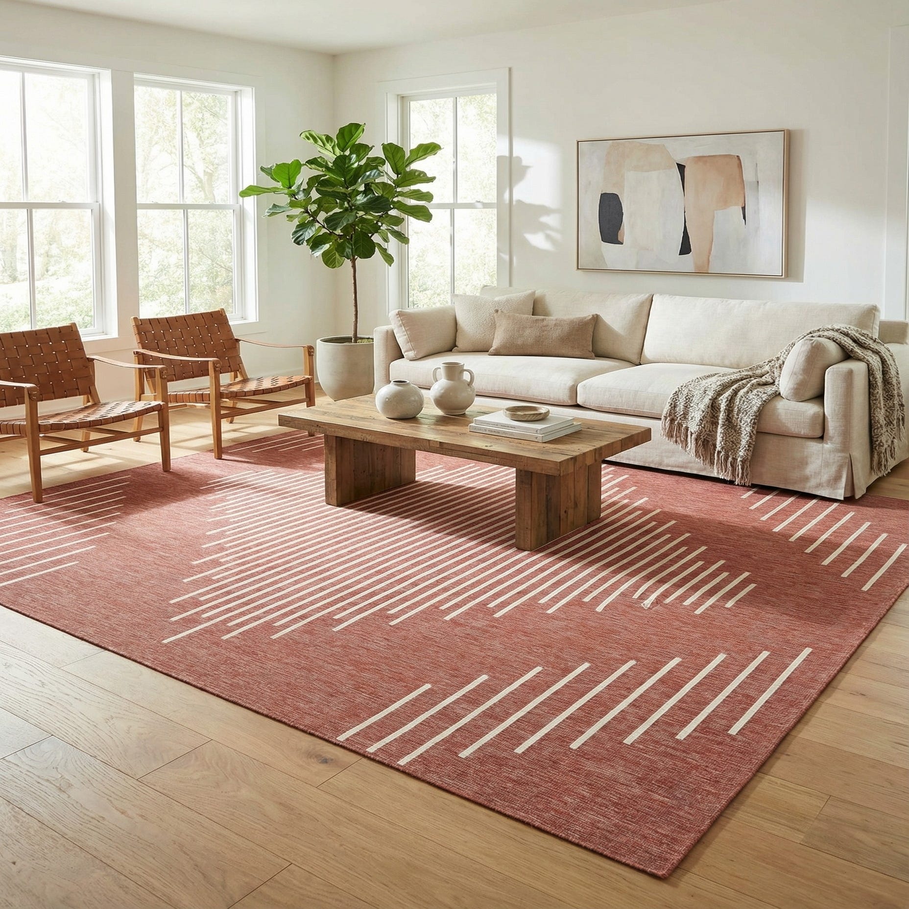 This rug works well on a covered patio or sunroom where the rust tone pairs nicely with natural wood and rattan furniture, or as a grounding piece in a modern living room with neutral upholstery and black-iron accents. It also complements eclectic outdoor dining setups and transitional interiors that mix warm metals and clean-lined furnishings.