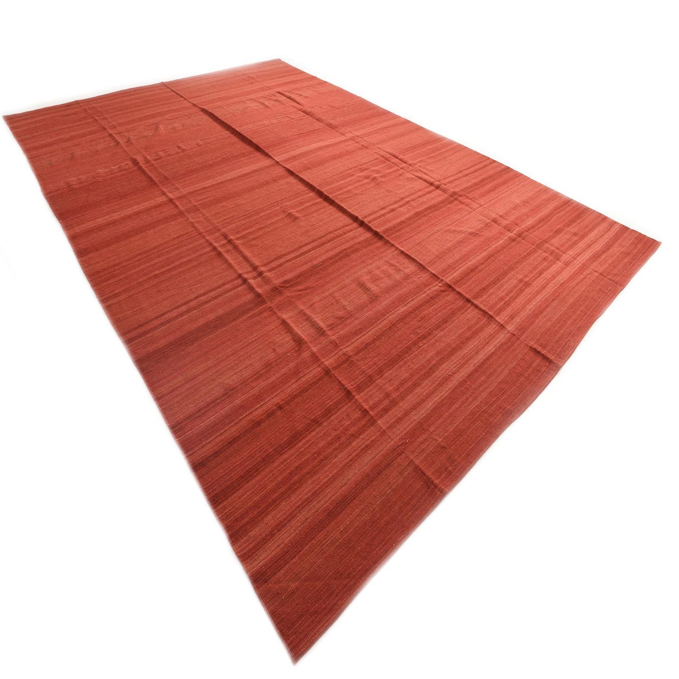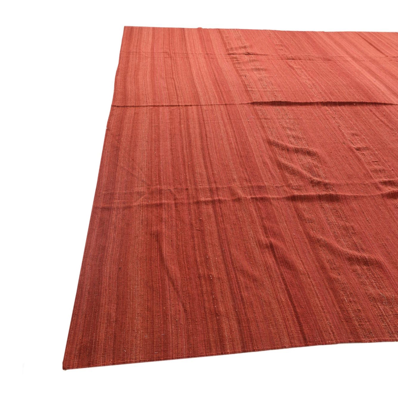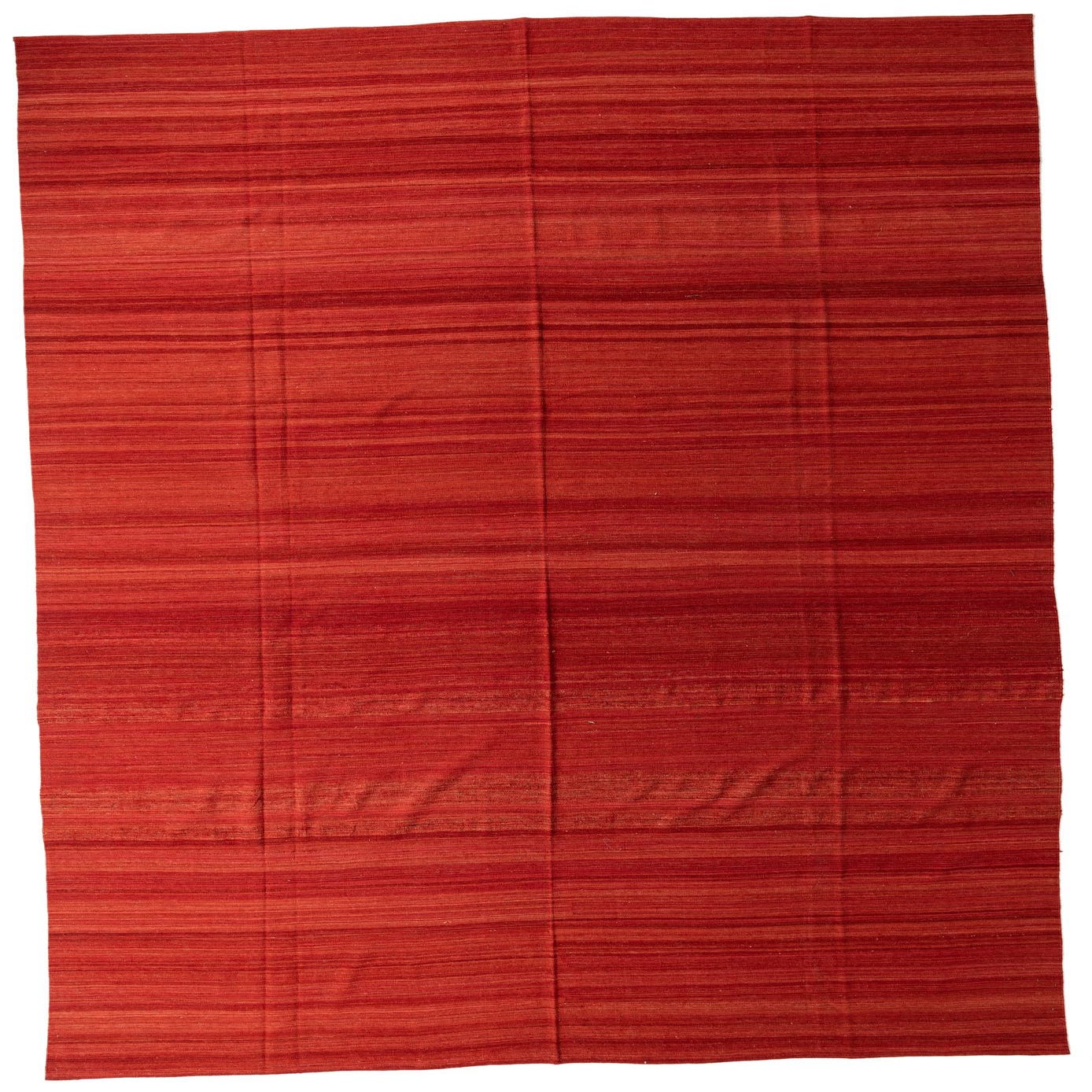 A large 13x18 rectangular Kilim Modern rug with horizontal stripes in varying shades of orange and red, showcasing its flatweave texture.