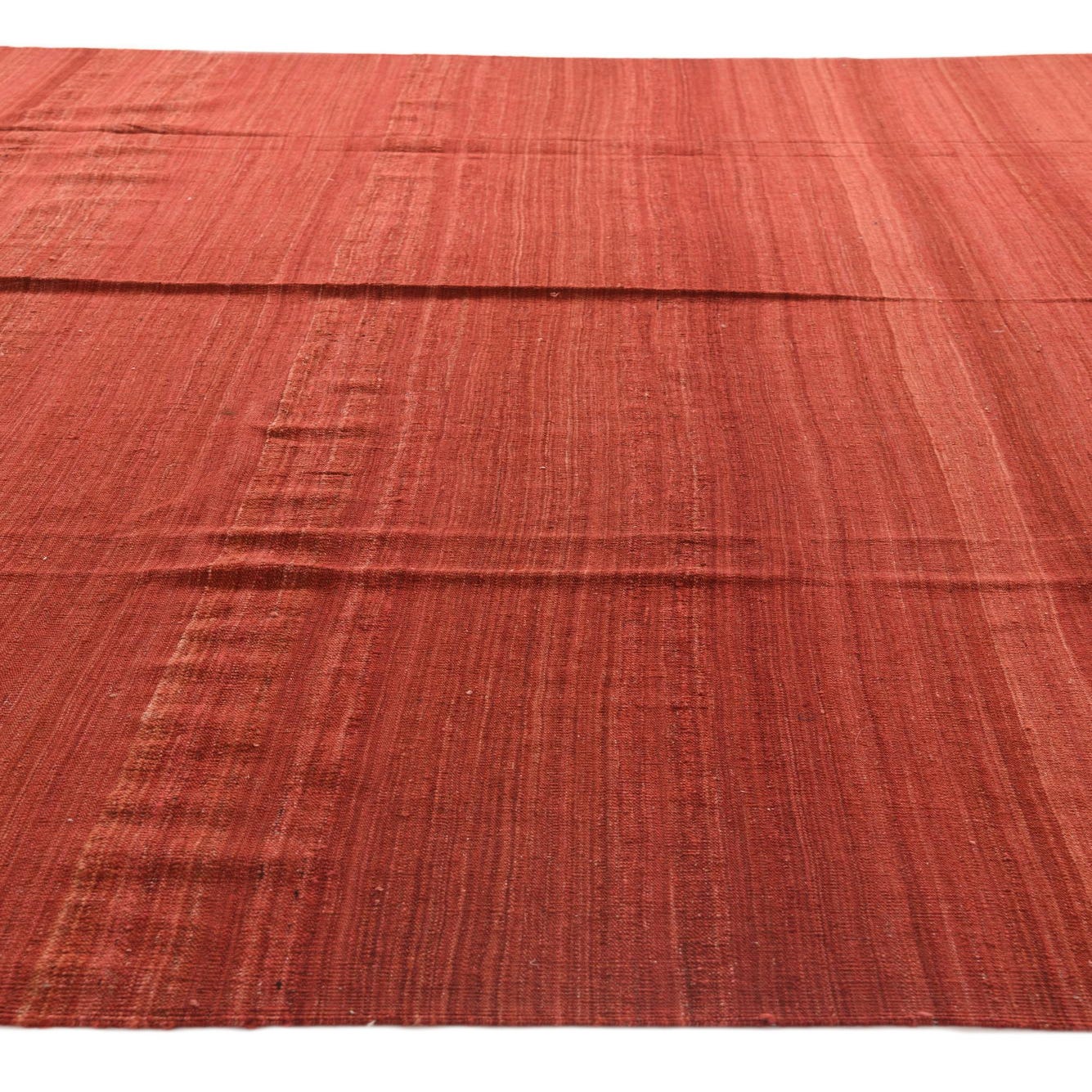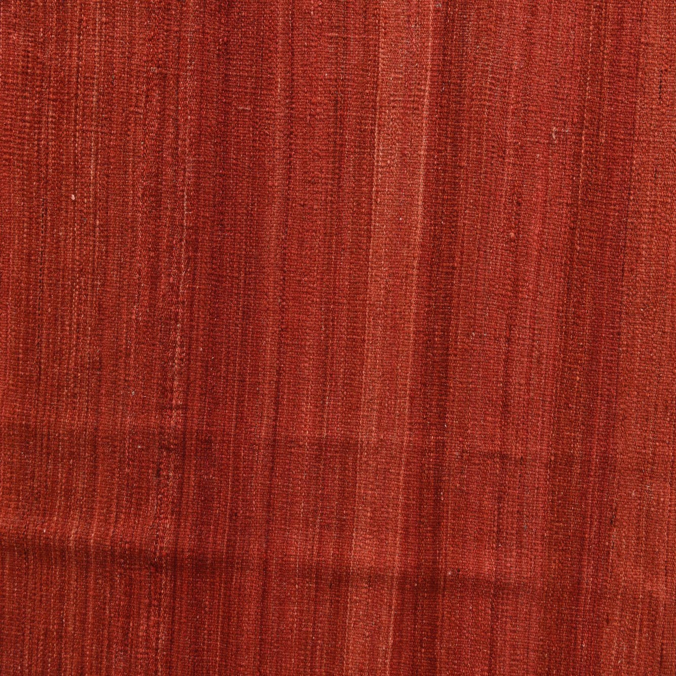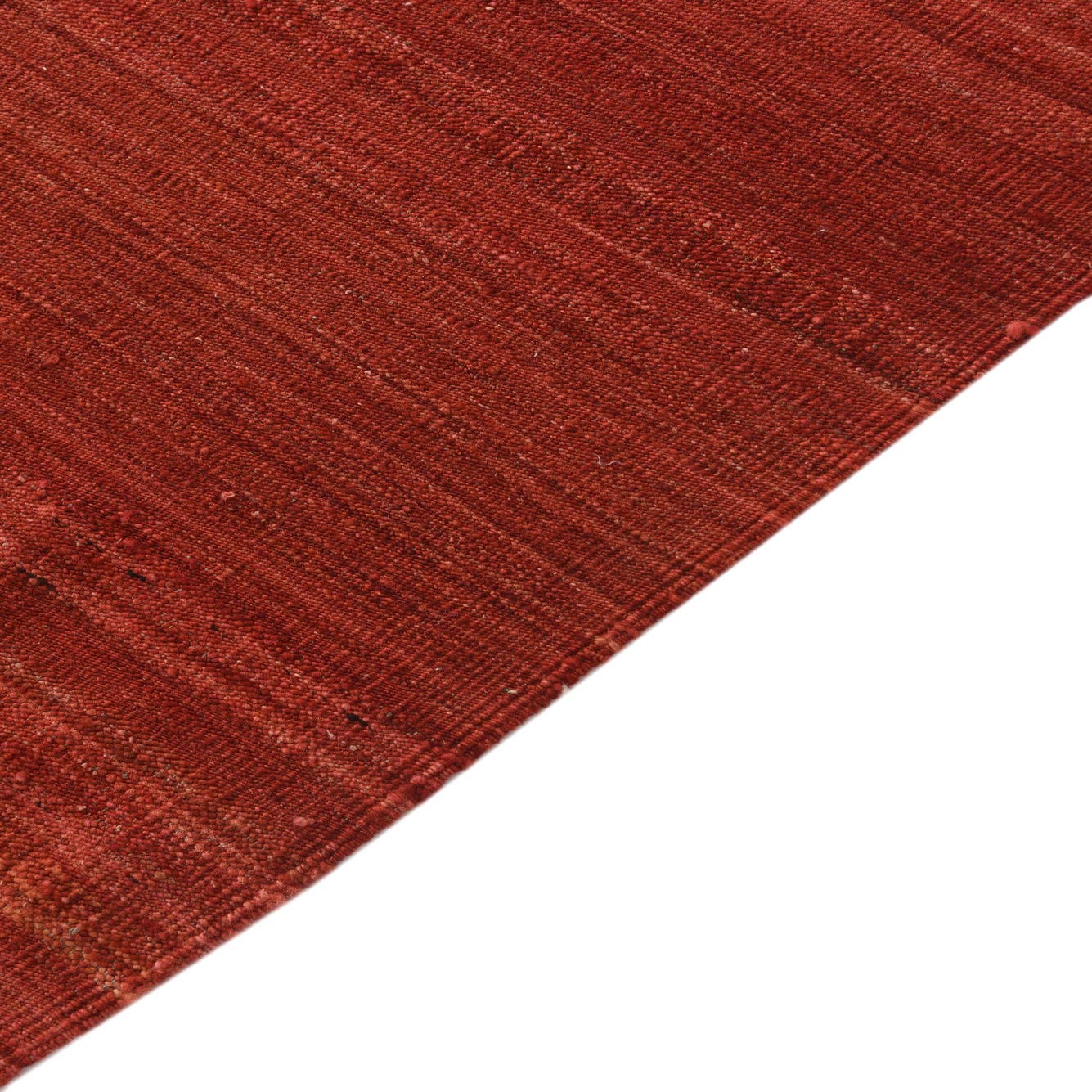 The rug's pattern is a subtle integration of color variations and gentle shifts that create a minimalist yet engaging aesthetic. The striations of beige and red across the rust red field provide an understated visual interest, enhancing the rug's overall appeal without overwhelming the space.