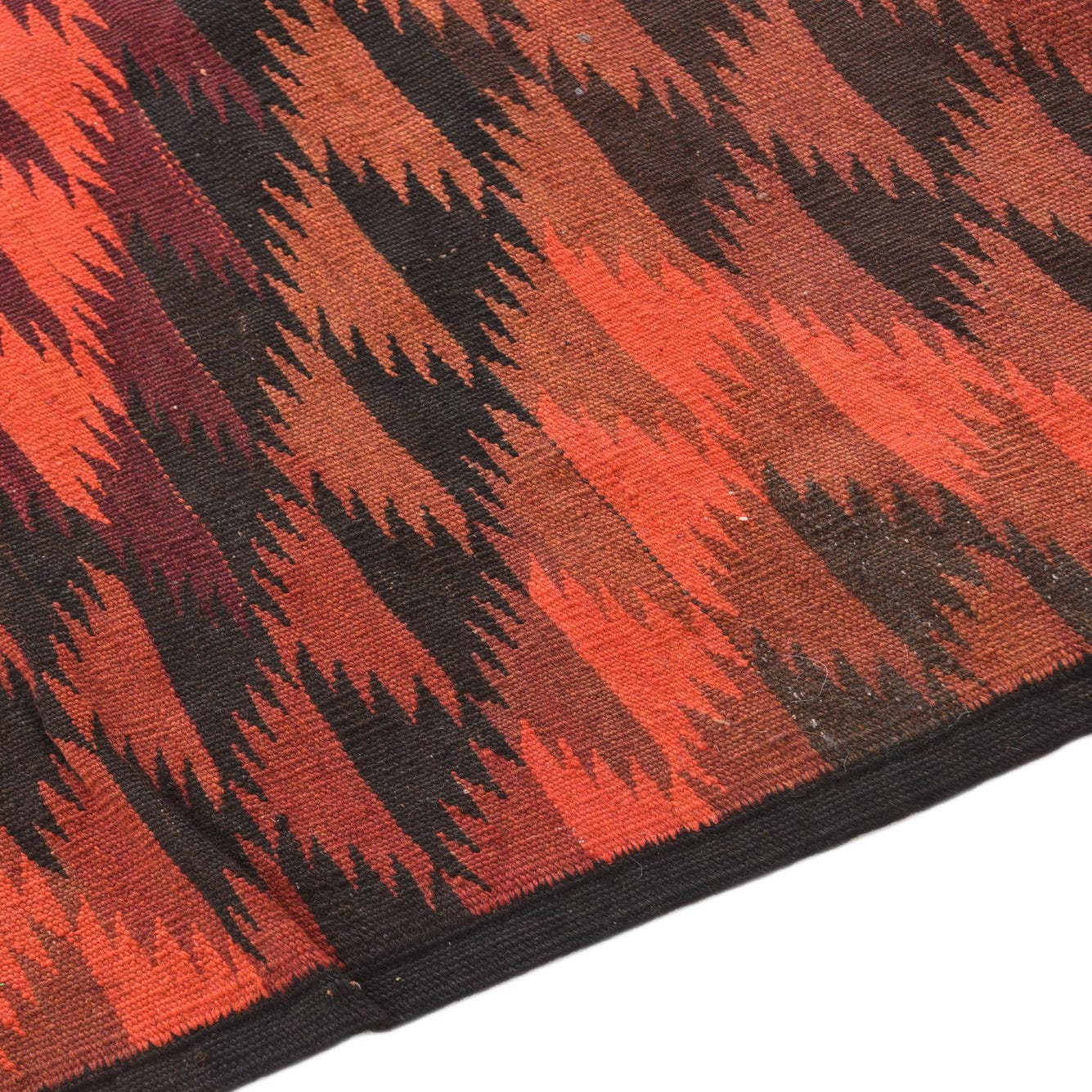 Hand-woven of 100% wool, this kilim runner displays a tightly woven flatweave with stepped diamond motifs set against a rust red background. Bands of black, burgundy, orange and brown interlock in a rhythmic, chevron-like pattern that forms subtle central medallions. The surface is low-profile and tactile—firm underfoot with the characteristic textured weave of traditional kilims—and finished with narrow guard stripes and knotted fringe at each end.