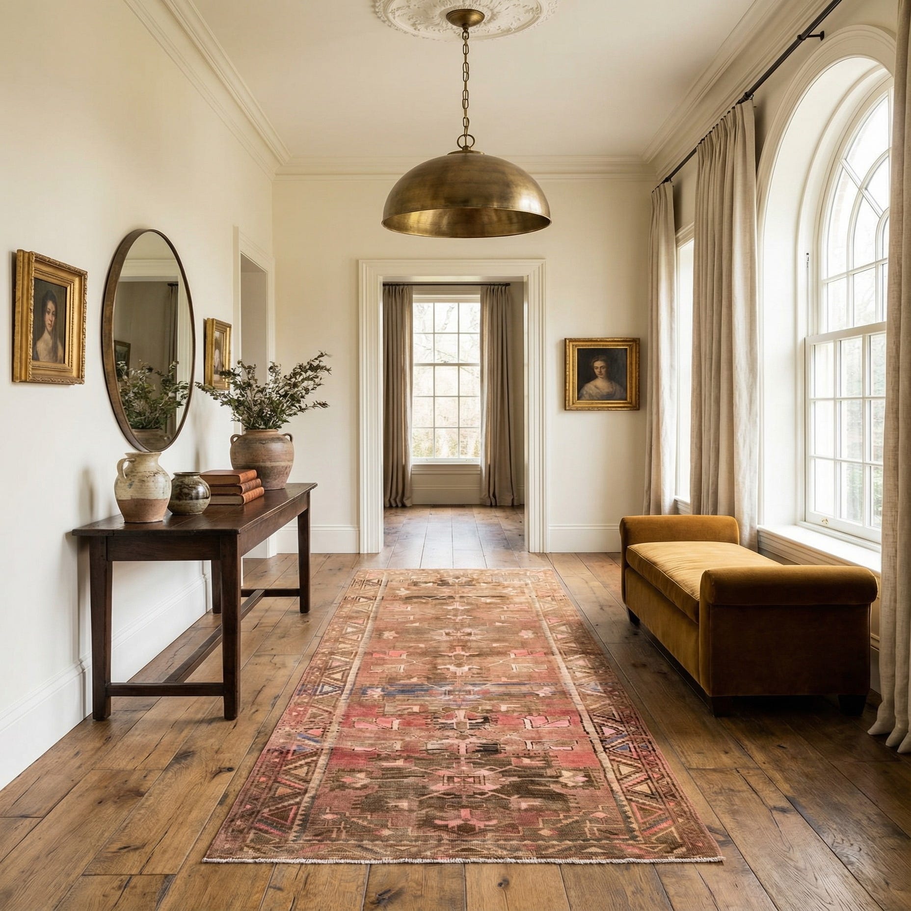 A long 14 ft runner rug in a vintage Persian style, featuring a blend of oranges, reds, and browns with intricate patterns, ideal for a hallway.