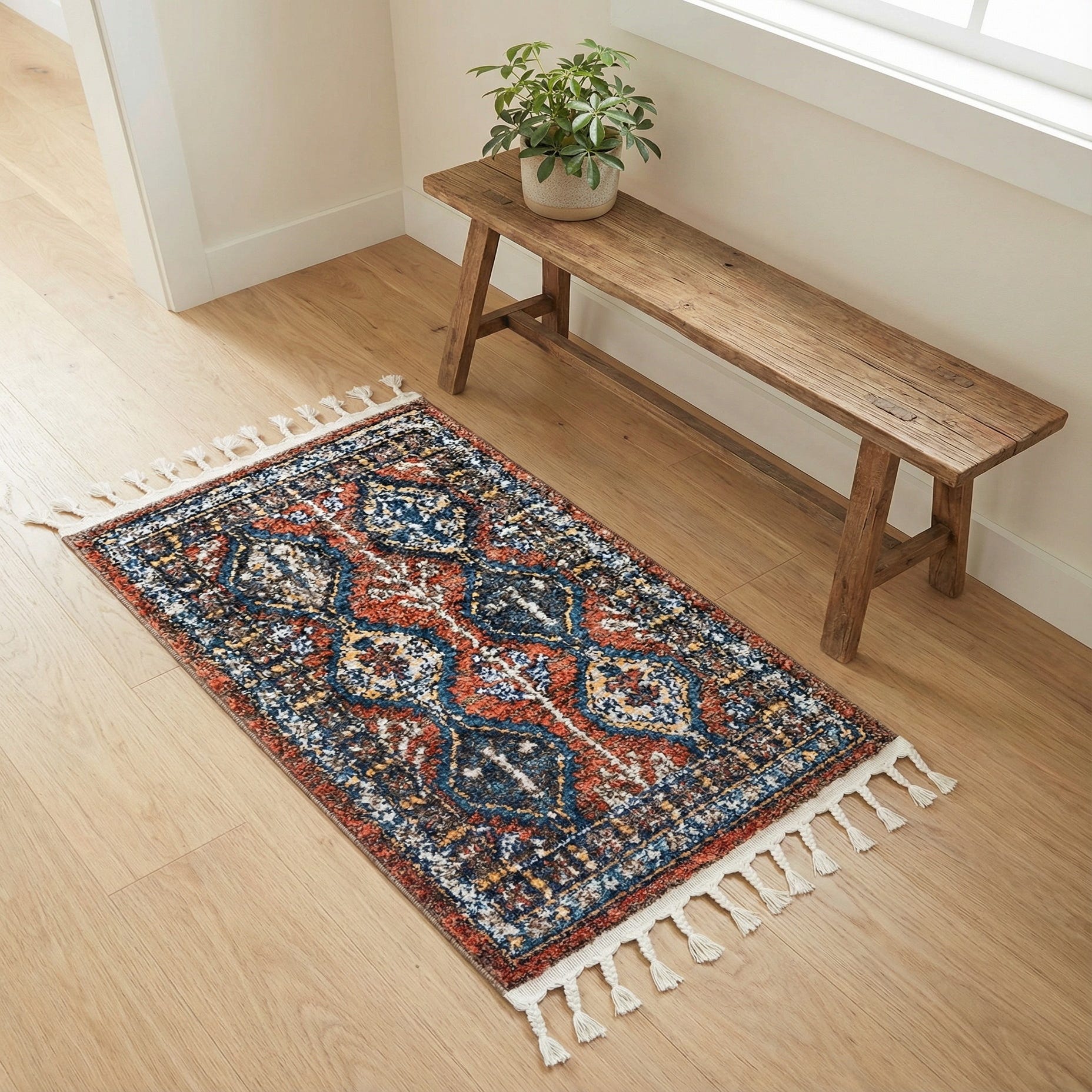 Machine-made of polypropylene, the pile is dense and softly plush to the touch, with enough texture to catch the light and show off the multi-tonal colorwork. Use it to define a small seating nook, place it by the bedside for a cushioned step in the morning, or layer it over a larger neutral rug for visual interest. It pairs well with warm wood finishes and leather pieces in traditional, transitional, or eclectic interiors, and it can add a colorful anchor to entryways and compact living spaces.