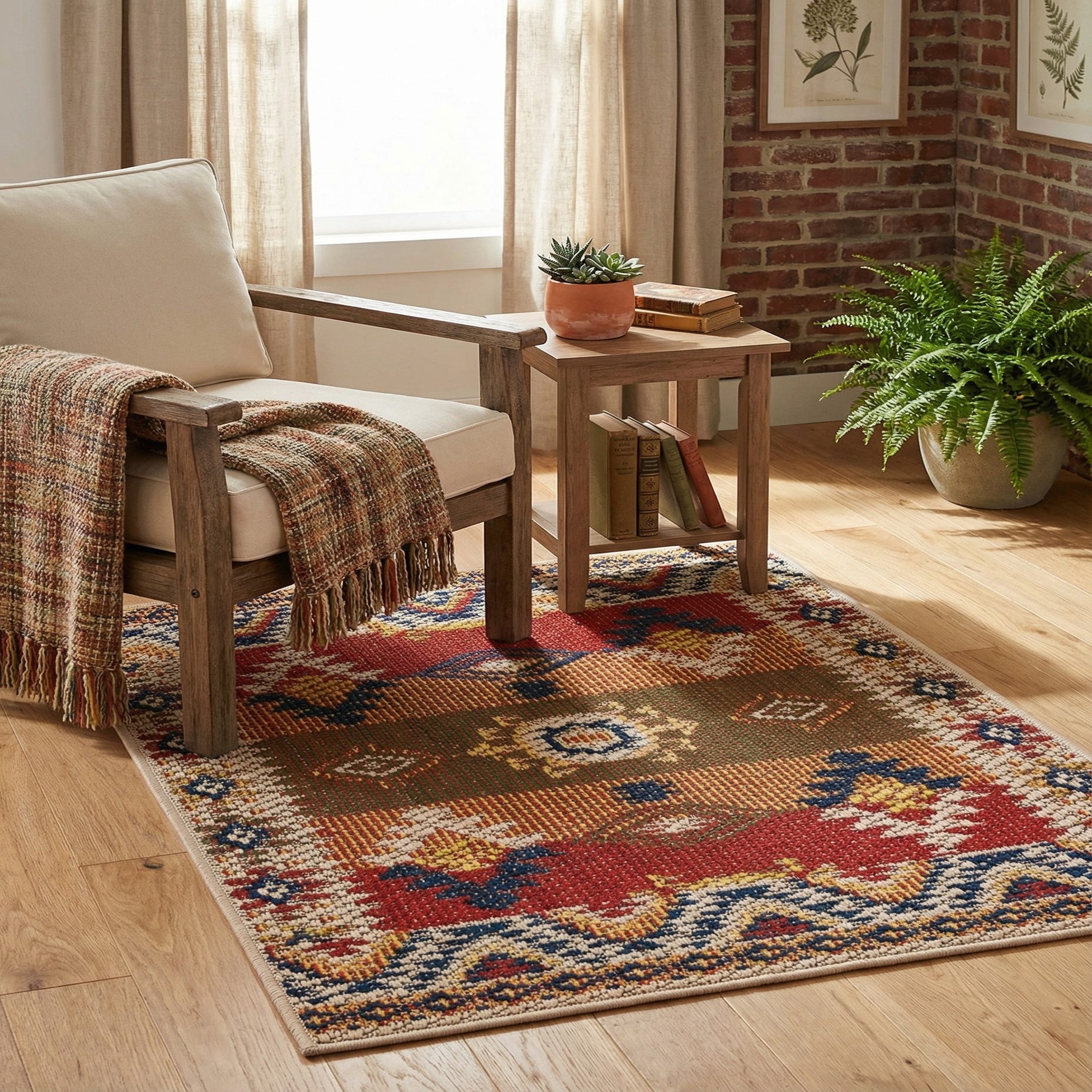 Made of 100% polypropylene, the texture is low-profile and tightly woven — dry to the touch with a subtle, ribbed hand that holds pattern definition and color contrast. Place it on a covered porch or patio, at a breezy kitchen entry, or layered under a small bistro set; it pairs especially well with reclaimed wood, rattan seating, warm leather, or neutral linen upholstery to round out boho, Southwestern, or casual farmhouse schemes.