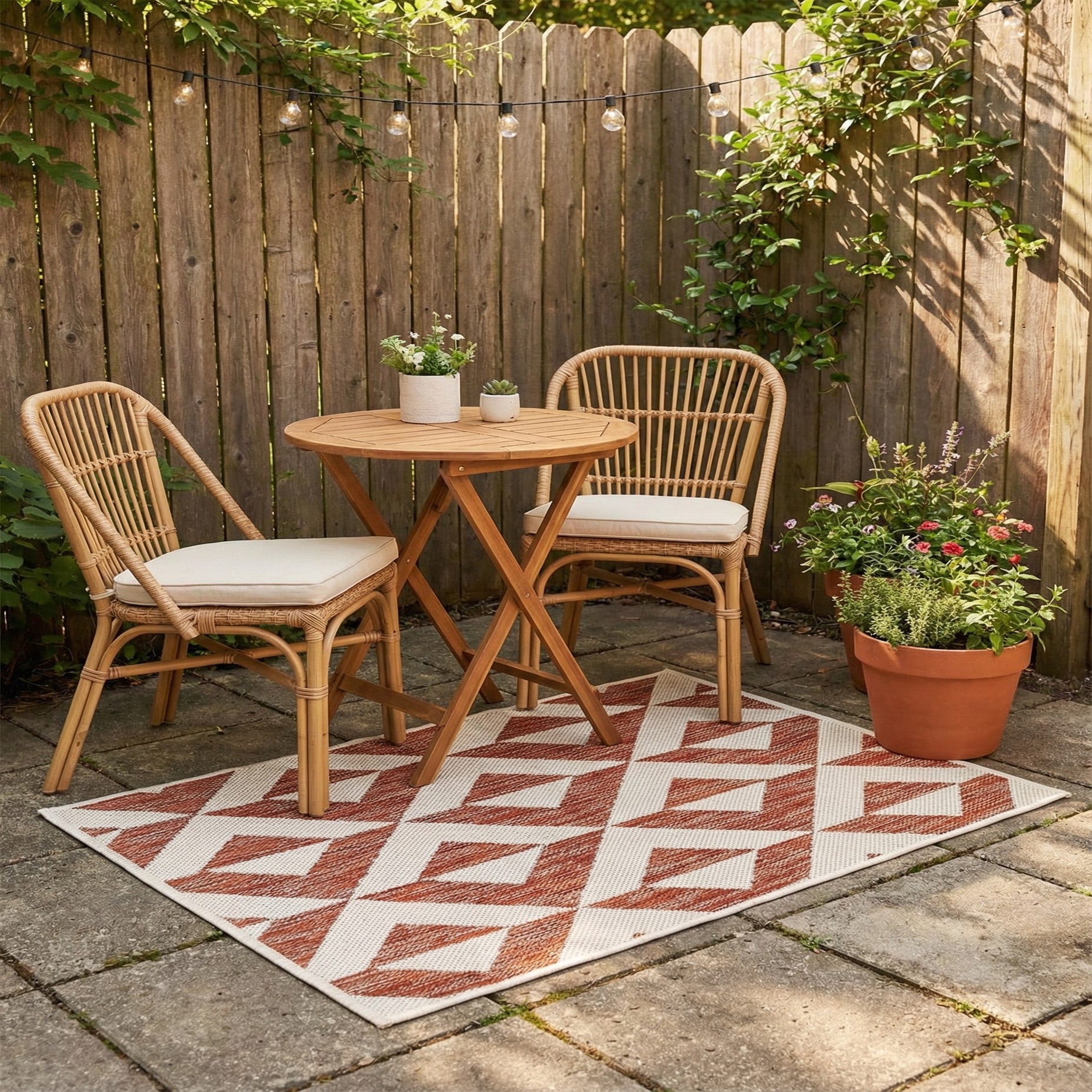 This rug works well as an accent on a covered porch or balcony, layered in an entryway, or placed under a small bistro set or bedside area to introduce color and pattern without overpowering the space. Pair it with warm wood furniture, woven rattan, neutral linens, or matte metal accents for a balanced look; it also complements both contemporary and transitional interiors, and can anchor a compact seating area or mudroom with its strong graphic presence.