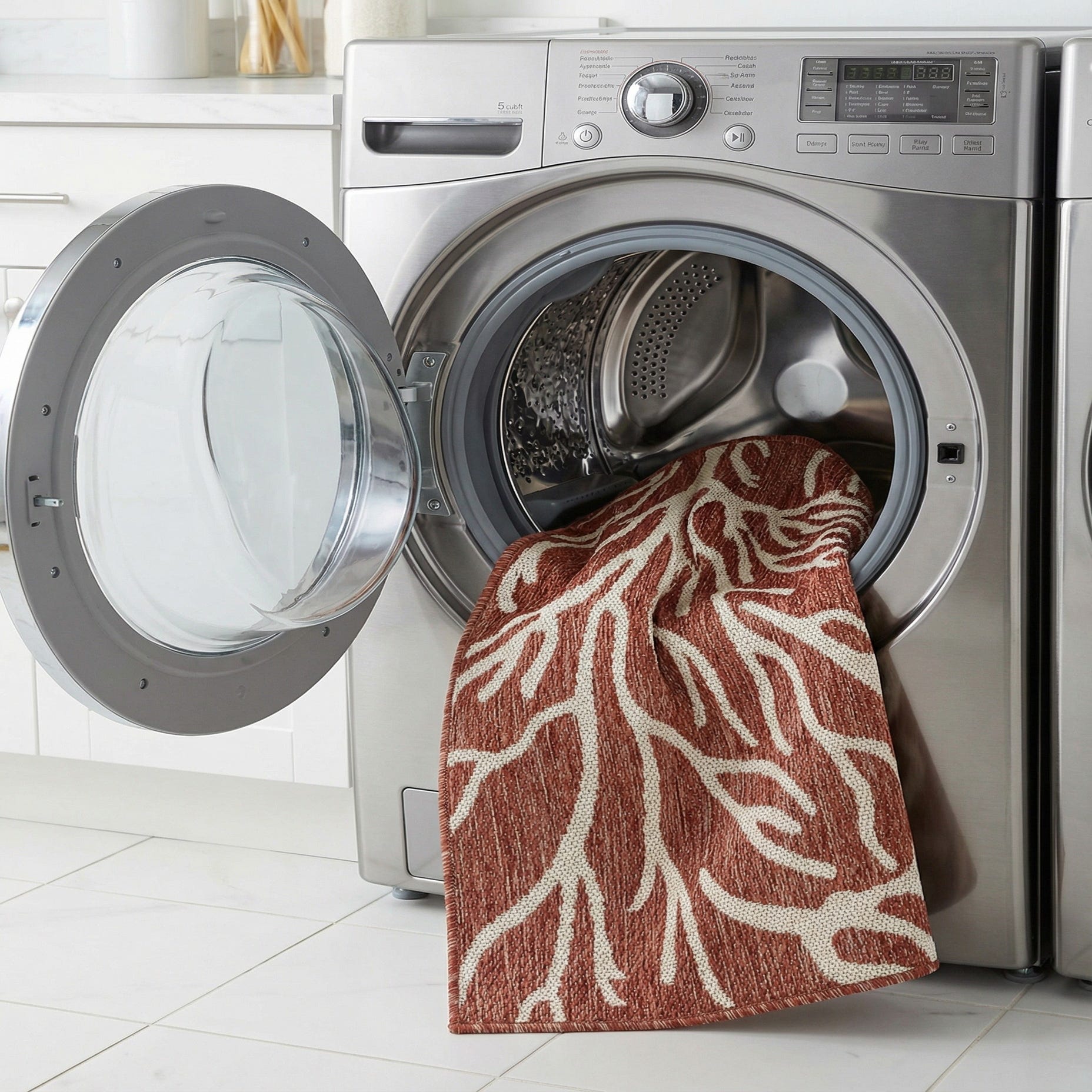 A 2x3 rectangular indoor/outdoor rug with a modern coral pattern in burnt orange and off-white, ideal for a patio or entryway.