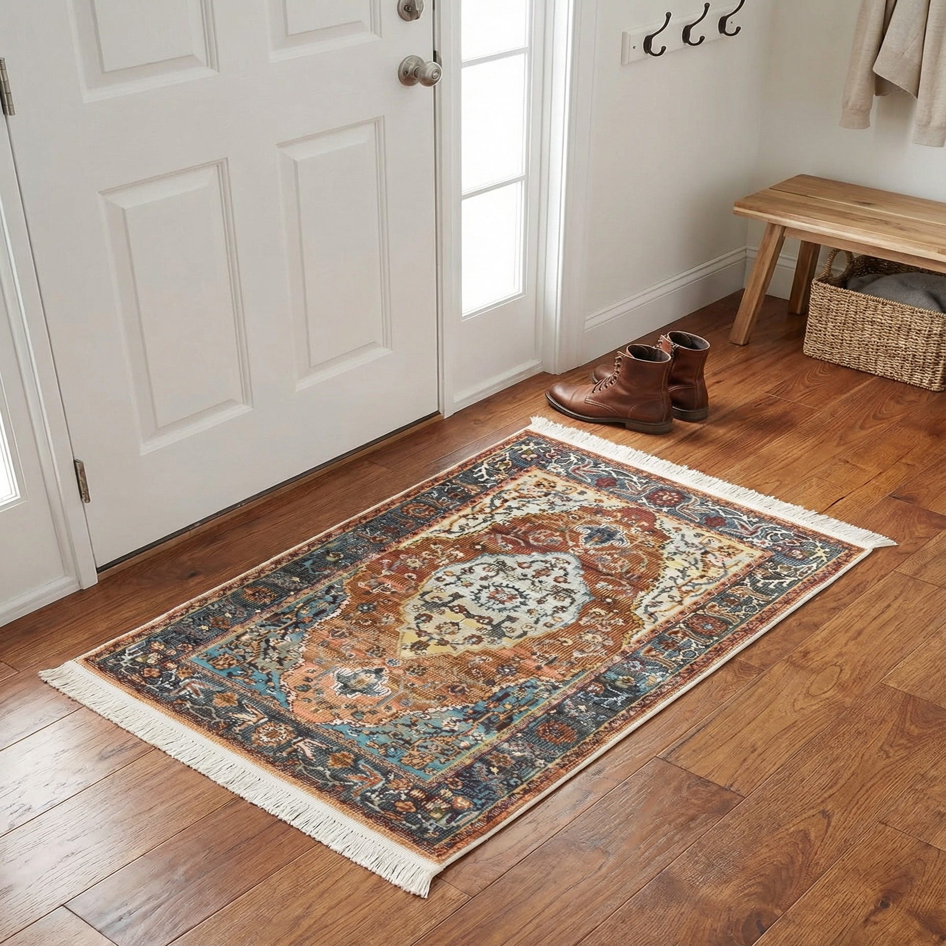 This piece works well as a focused accent in smaller spaces — place it in an entryway, at the foot of a bed, in a reading nook, or layered under a small coffee table to add pattern without overwhelming the room. It pairs easily with warm wood furniture, navy or cream upholstery, and metal finishes in brass or aged black for a transitional look; it also complements eclectic or bohemian schemes when combined with textured throws and layered textiles.