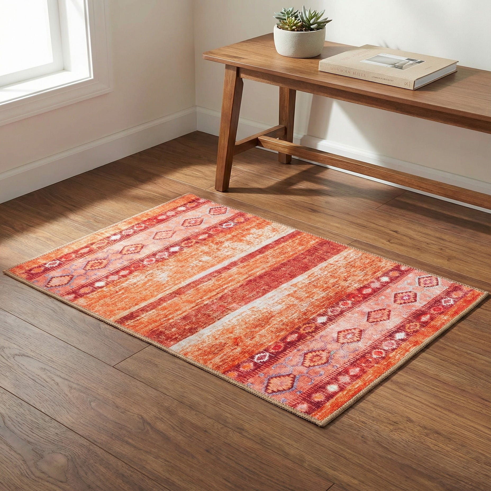 Machine made of 100% polyester, the surface feels soft underfoot with a low, textured pile that highlights the rug’s brushed, antiqued finish. Use it to bring color and personality to a hallway or entry, layer it in front of a sofa to anchor an eclectic living area, or place it at the foot of a bed to warm neutral bedding and wood tones. It pairs especially well with natural-fiber upholstery, warm stained woods and mixed-pattern accents for a cozy, collected look.