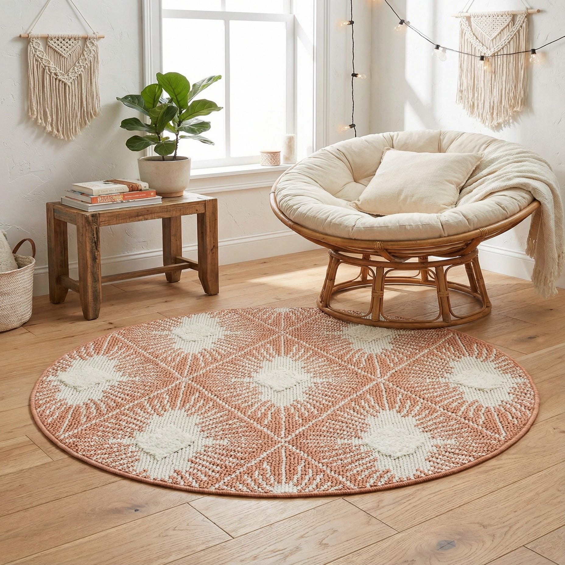 A round 3' 3 x 3' 3 orange and off-white Bohemian rug with a modern trellis pattern and textured pile.