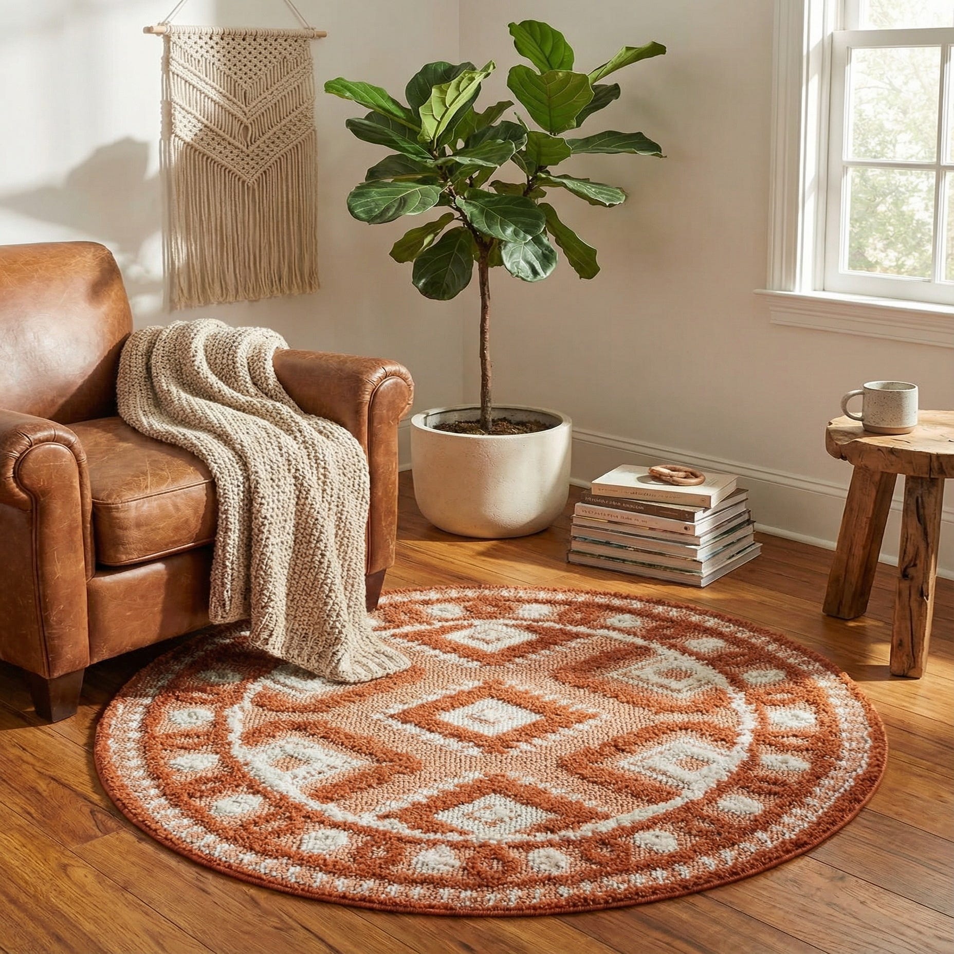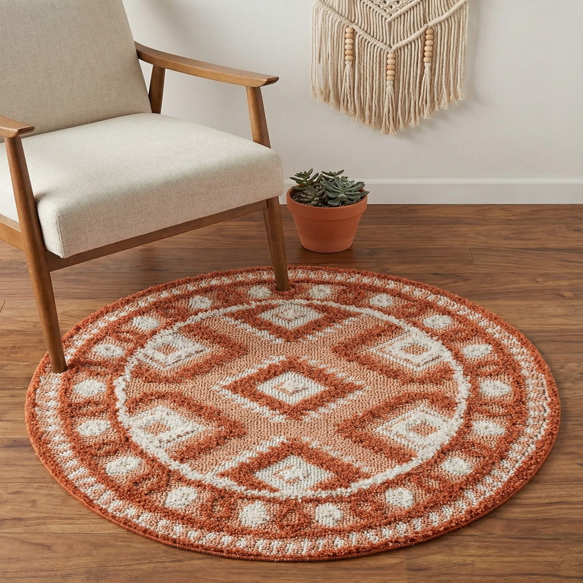 This piece works well as an accent in small seating areas, an entryway, or layered beneath a bistro table or bedside chair to add color and texture. Pair it with warm wood tones, leather or rattan furniture, woven throws and matte metal accents for bohemian, southwestern, mid-century, or eclectic interiors where the rust-and-ivory palette can bring warmth and visual interest.
