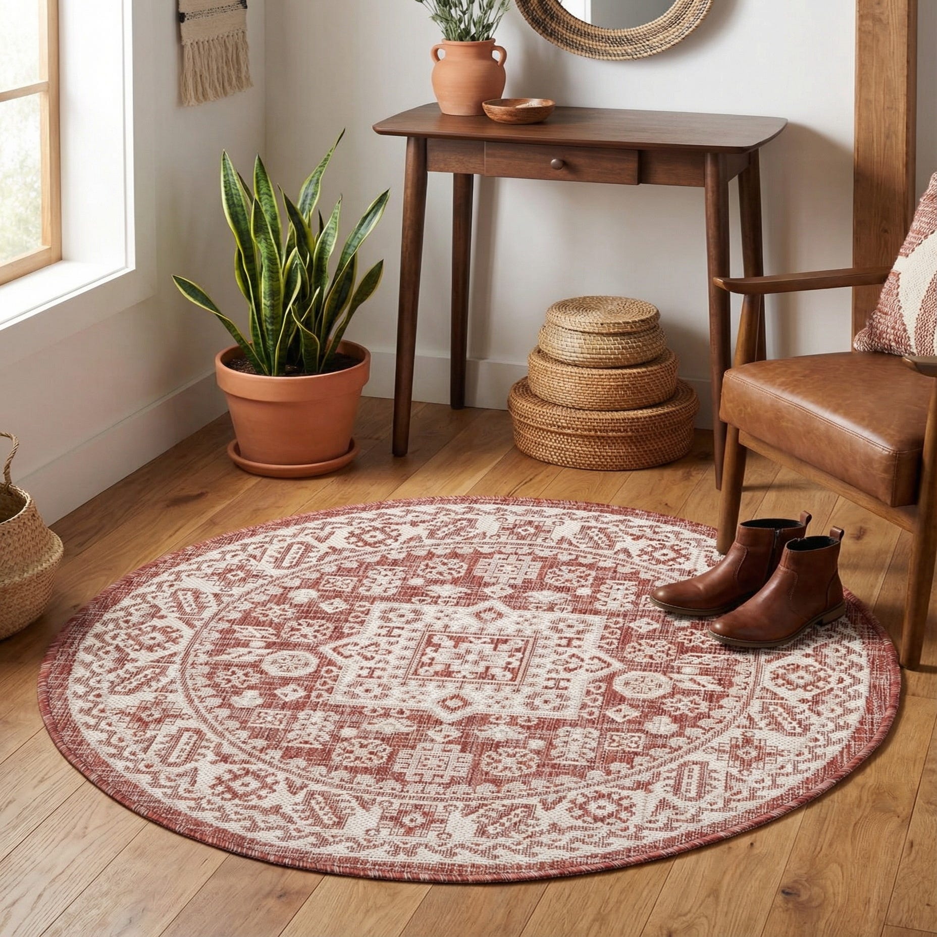 Use this round rug to define a cozy conversation nook, anchor a small bistro or dining set on a covered patio, or add color and pattern to a sunroom or entry. It pairs naturally with warm woods, rattan or leather seating, neutral linens, terracotta planters and woven accents, and complements bohemian, southwestern, modern farmhouse or transitional interiors. The round shape works especially well under circular tables or layered atop a larger rectangular rug to create a focal point.
