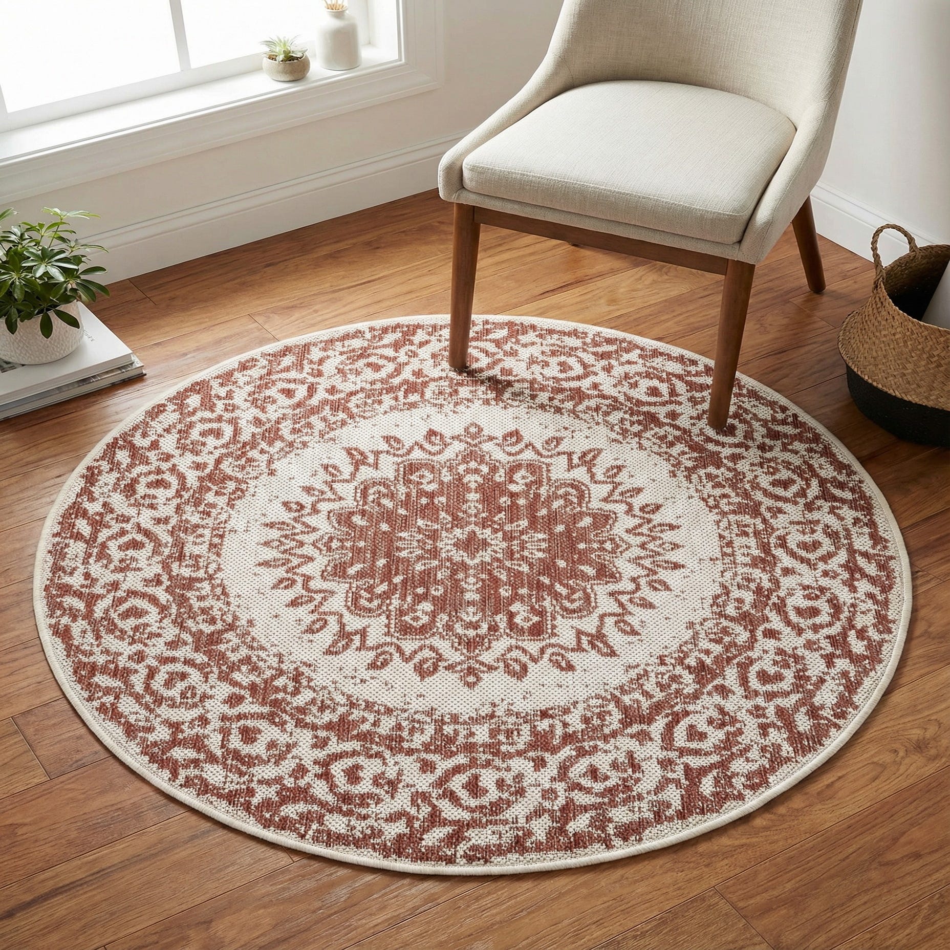 A classic medallion design centers this round rug, with layered floral and scroll motifs radiating out into a complementary border. The rust red background provides a warm, earthy foundation while the ivory patterning adds crisp contrast and definition. Subtle distressing across the design gives a gently worn, time-honored appearance that fits traditional styling without feeling formal.