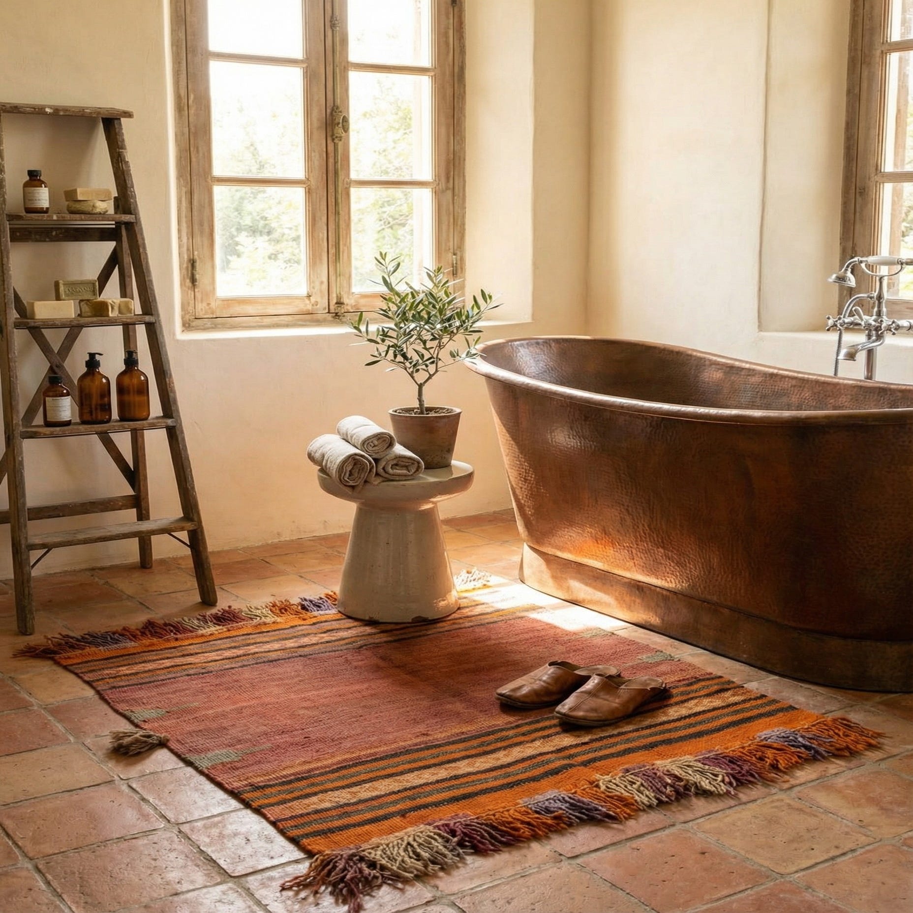 Finished with fringe, the Kilim Afghan rug adds texture and a touch of the eclectic to any room. With its earthy and warm tones, it is especially suited for interiors that feature natural materials and a rustic or bohemian aesthetic. It can serve as a stand-alone focal point in a minimalist setting or complement a room with rich, wooden furnishings and handmade artisanal decor. Whether placed in a home office, cozy reading nook, or as an accent in a living area, this rug's versatile colors and timeless design ensure it will harmonize with a variety of decor scenarios.