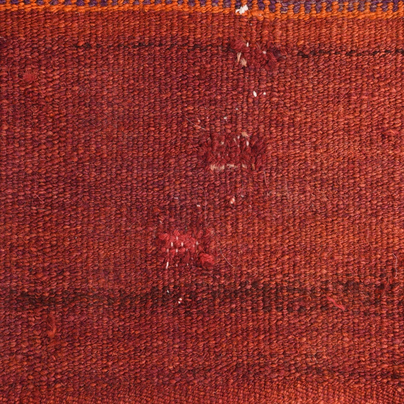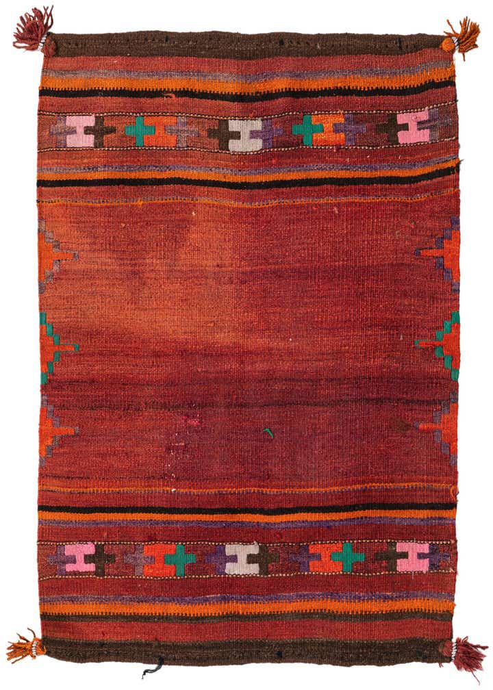 Primary color is Rust Red. Colors in this rug include: Rust Red, Green, Ivory, Orange, Purple, Pink, Brown.