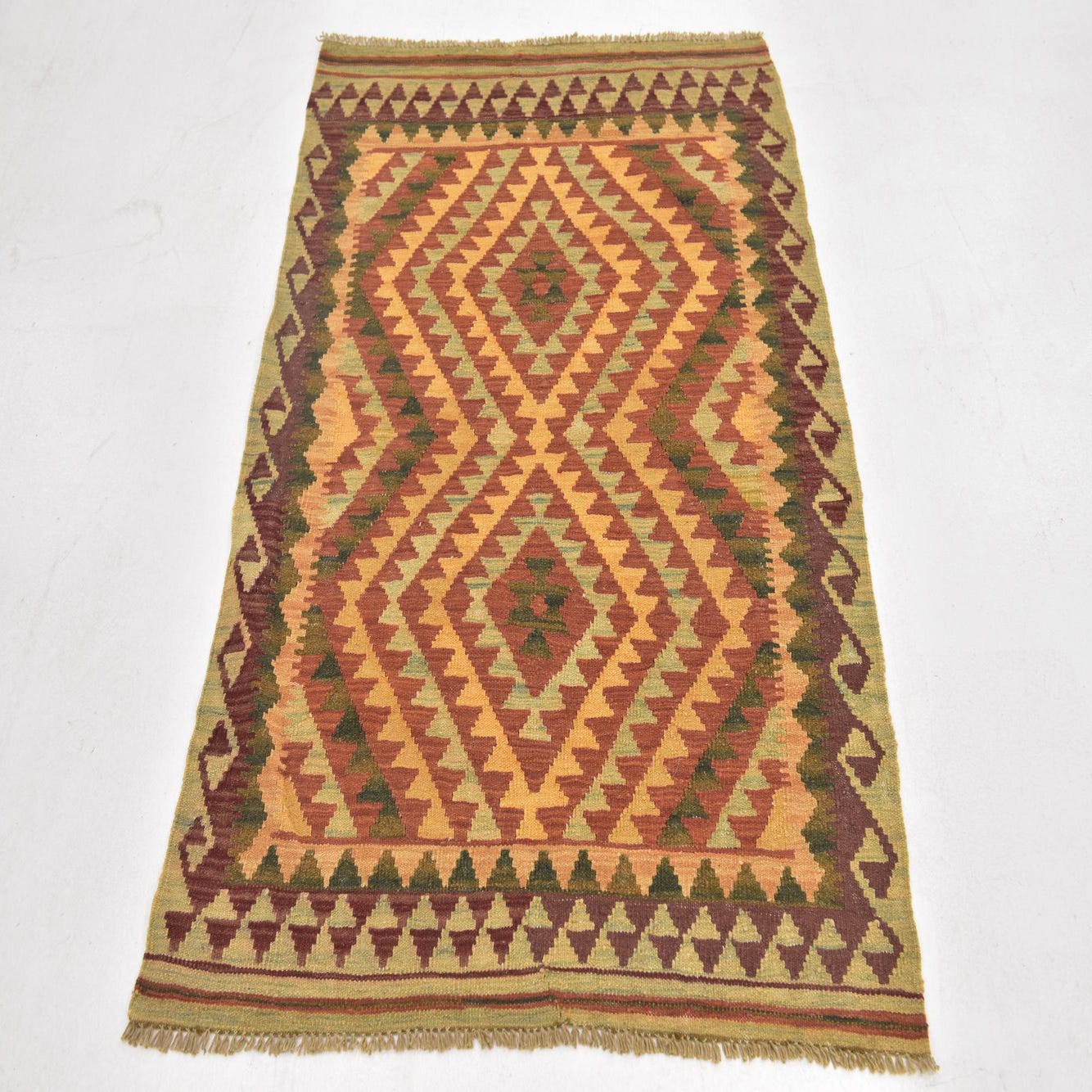 A 3x4 rectangular Kilim Waziri rug featuring a tribal medallion pattern in oranges, reds, and subtle greens on a flatweave wool.
