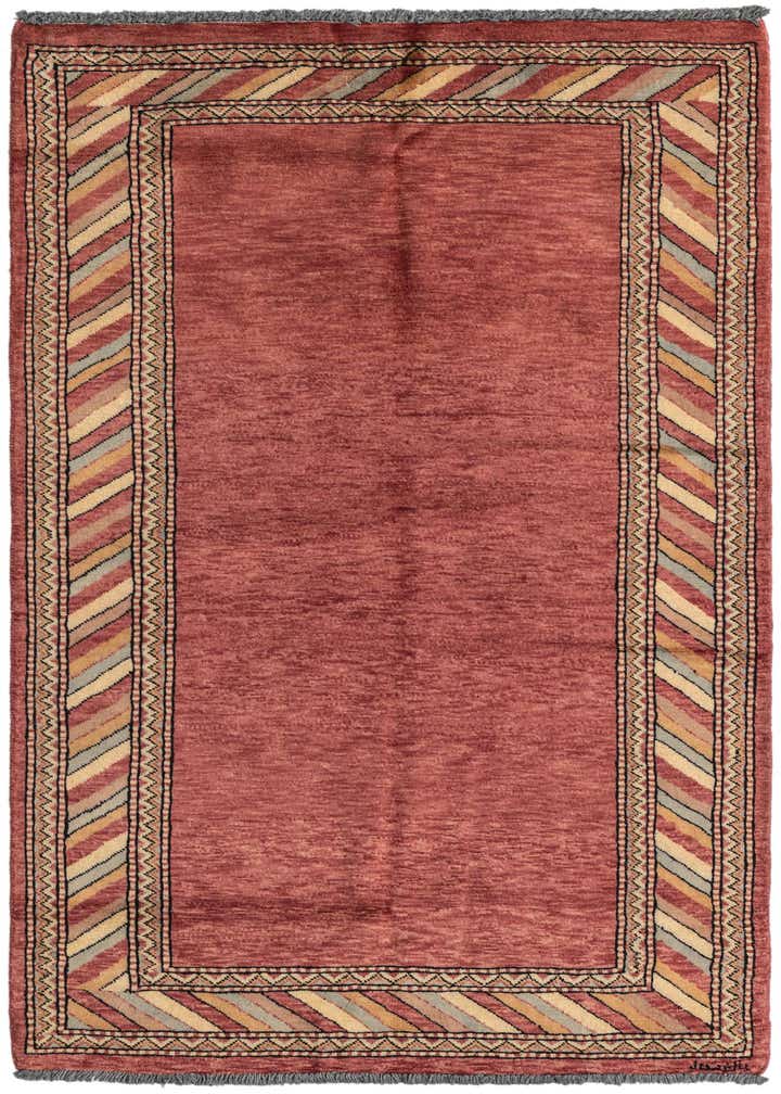 The Kashkuli Gabbeh collection presents a 3x5 hand-knotted rug crafted with 100% wool, reflecting a dedication to quality and craftsmanship. This rug features a rich rust red background color, complemented by a distinctive border incorporating black, gold, and gray hues. The border showcases a series of geometric stripes and patterns, eloquently framing the field. Its fringe adds a traditional touch that enhances its visual appeal.