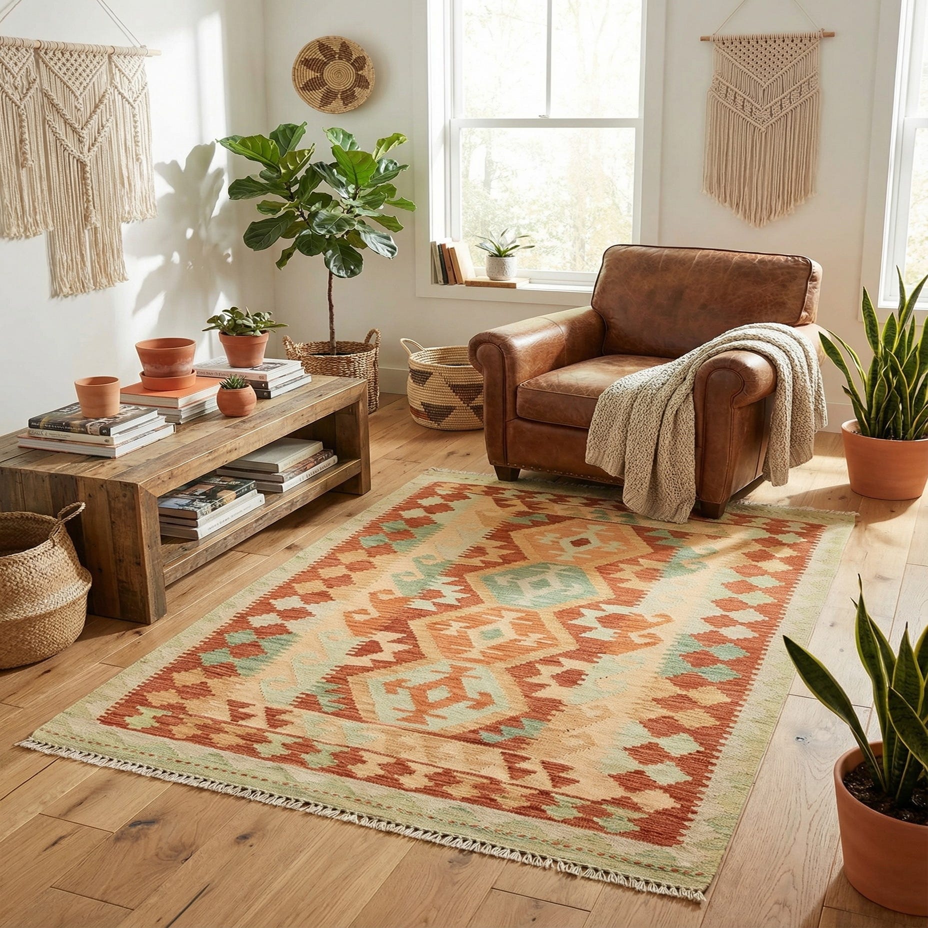 A 3x5 rectangular Kilim Waziri rug featuring traditional tribal patterns in shades of orange, red, and light green on a cream background.