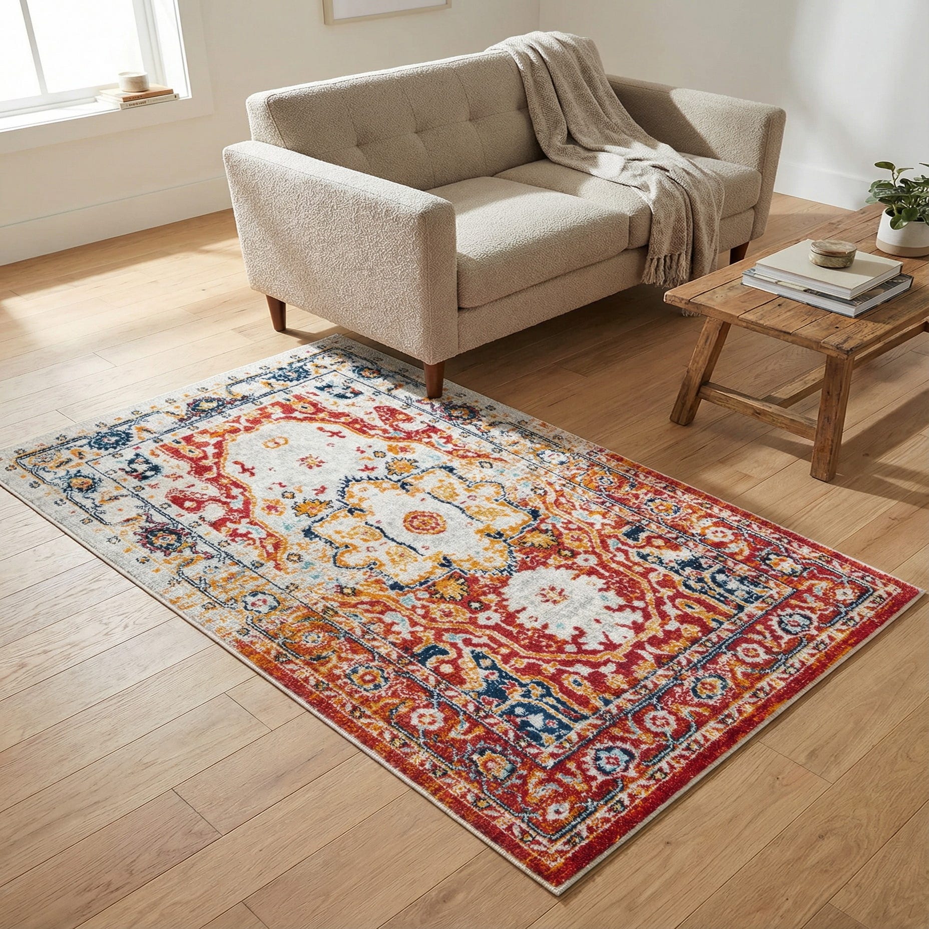 A vintage-inspired medallion layout and layered border create a classic, slightly distressed look across a rust red background. Ivory central motifs and gray accents sit against rich navy blue, red and orange details that trace floral and scrolling vine motifs, giving the design depth and movement. The surface is a low-pile, machine-made weave in 100% polypropylene that feels soft underfoot with a subtle, even texture that highlights the pattern without adding bulk.