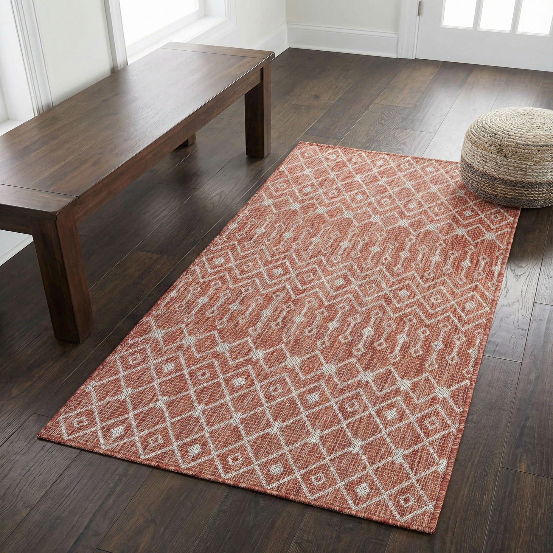 The rug has a low-profile, tightly woven surface that reads slightly textured to the touch—firm underfoot with a subtle ribbed weave visible up close. Machine made of 100% polypropylene, it holds its shape and color while offering easy placement options. Pair it with natural wood furniture, woven rattan seating, or simple metal bistro pieces for a casual porch or patio; it also works well in a sunroom, entryway, or layered over a larger natural-fiber rug to add color and pattern without overwhelming the space.