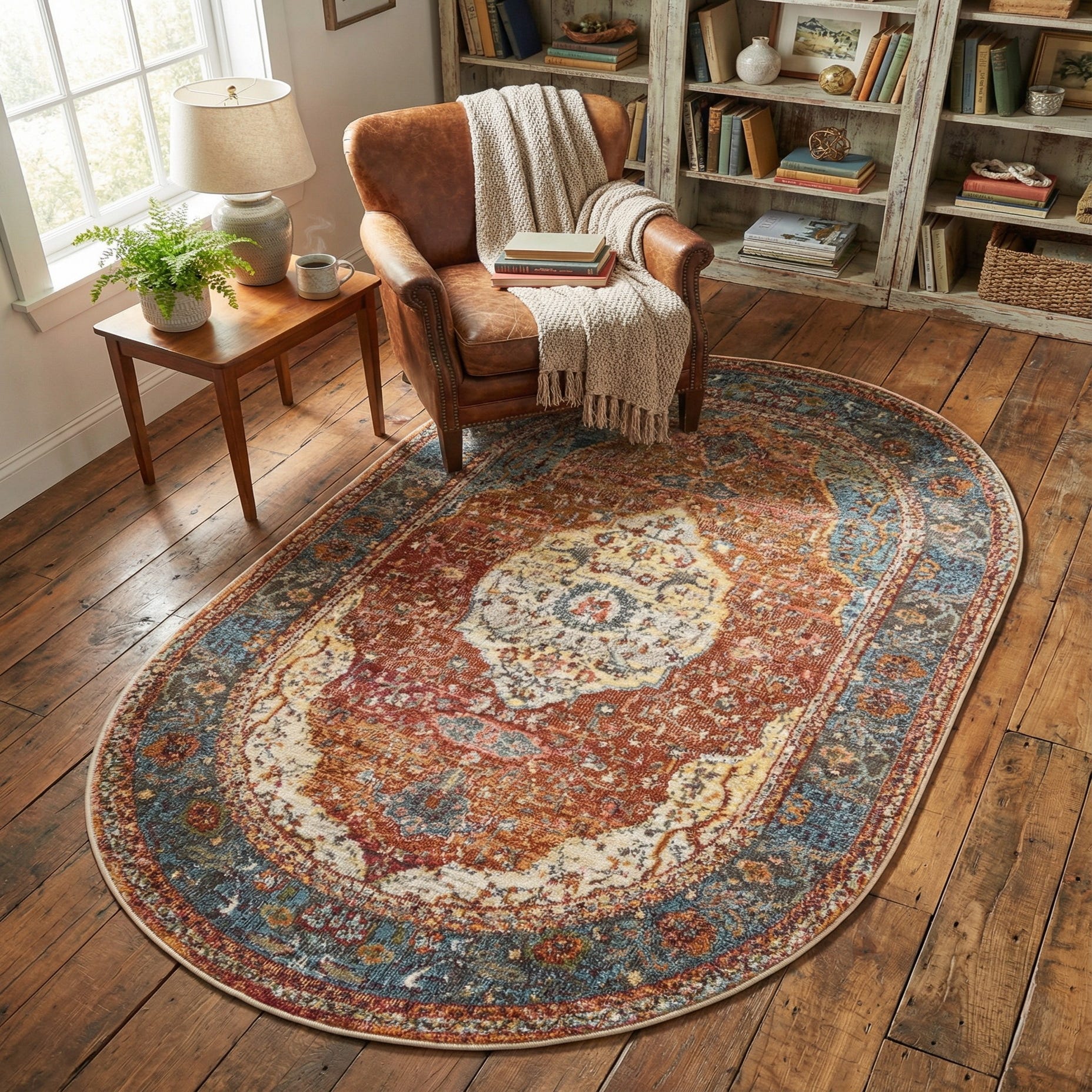 Primary color is Rust Red. Colors in this rug include: Rust Red, Blue, Ivory, Olive, Tan, Peach, Light Blue.