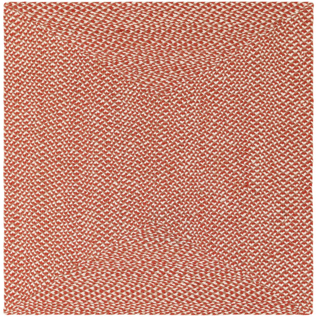 Hand-braided from 100% jute, this rug has a low-profile, textured weave you can feel with each step. The braided construction creates a rectangular, concentric pattern where the braid direction alternates to form subtle banding across the surface. The background is a warm rust red woven with ivory and light brown strands, giving the piece a tweed-like depth and an organic, earthy appearance.