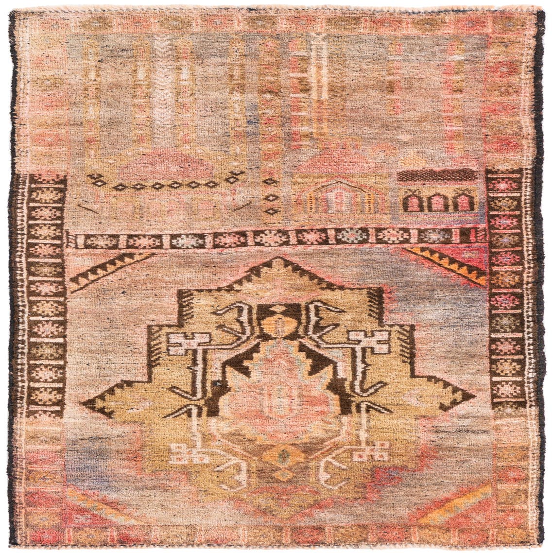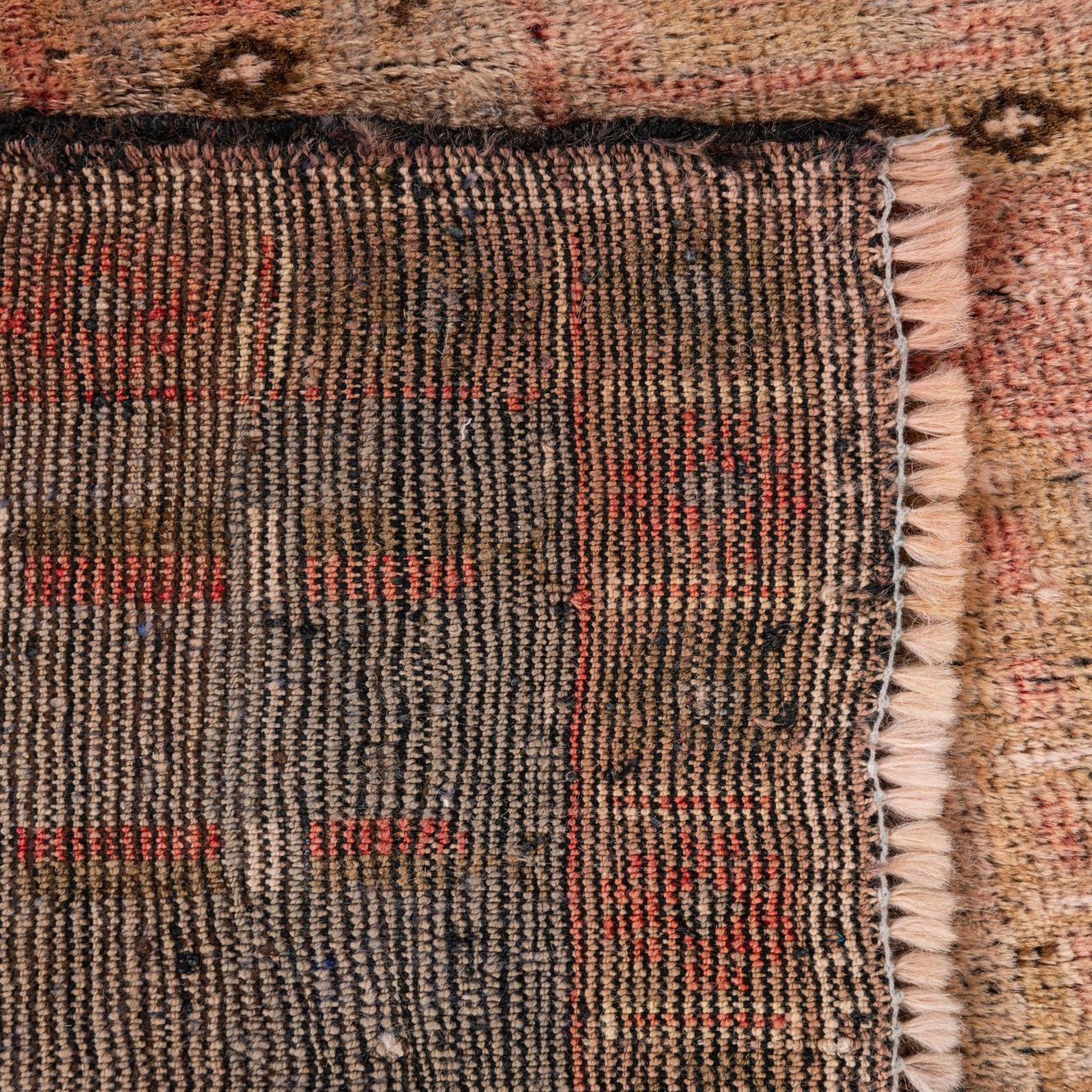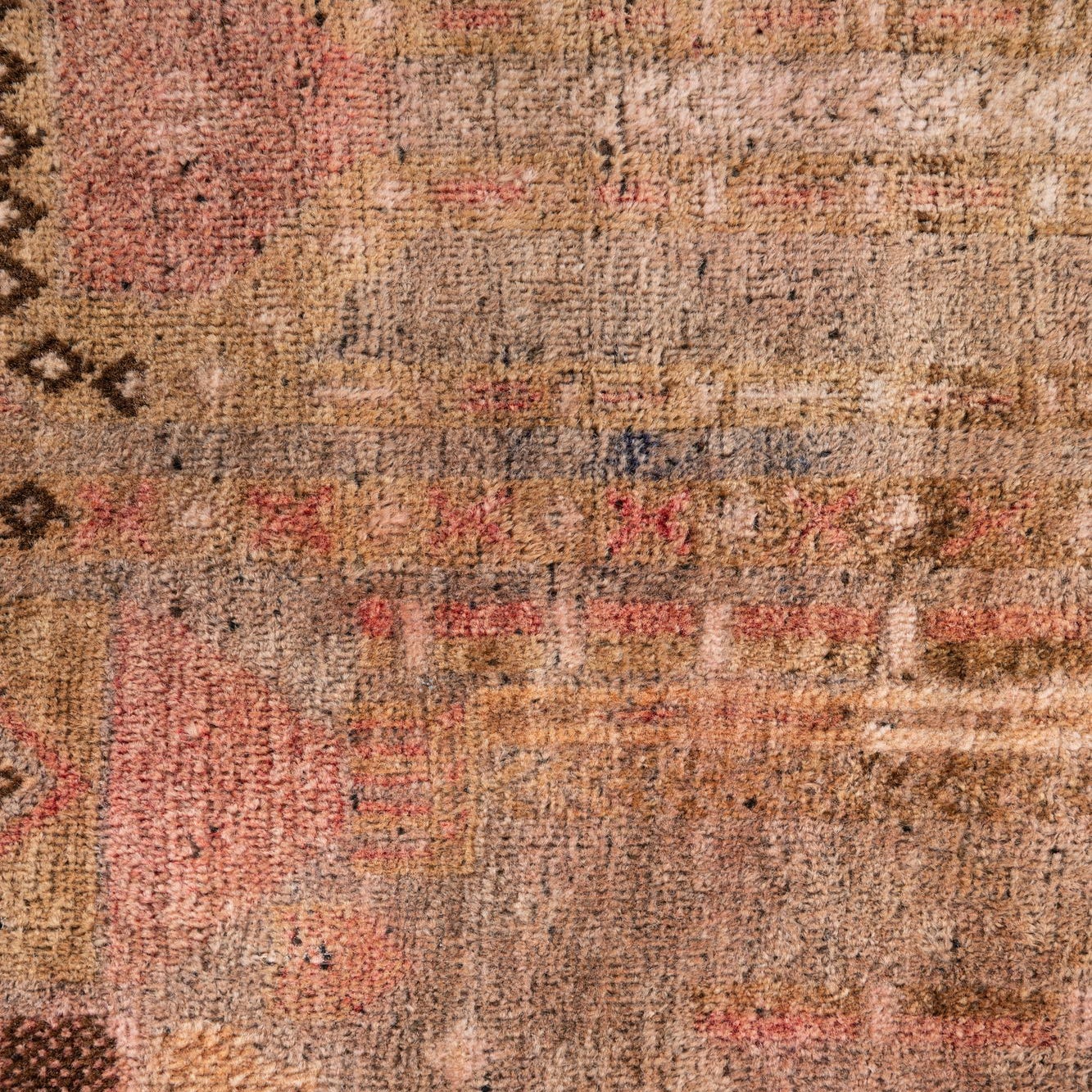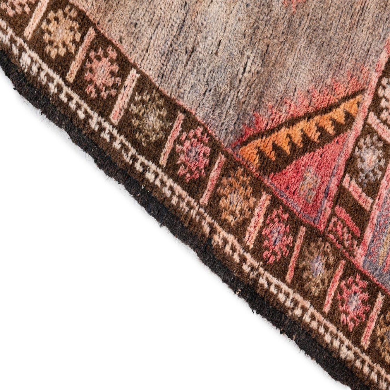 The hand-knotted wool surface has a dense, tactile nap that feels soft underfoot while holding its shape over time. Use this piece to ground a compact seating area or place it in an entryway to introduce color and pattern at the door. It also pairs well layered over neutral sisal or warm wood floors and complements leather sofas, brass accents and linen upholstery — a good fit for transitional, bohemian, or traditionally styled interiors that favor warm, earthy palettes.
