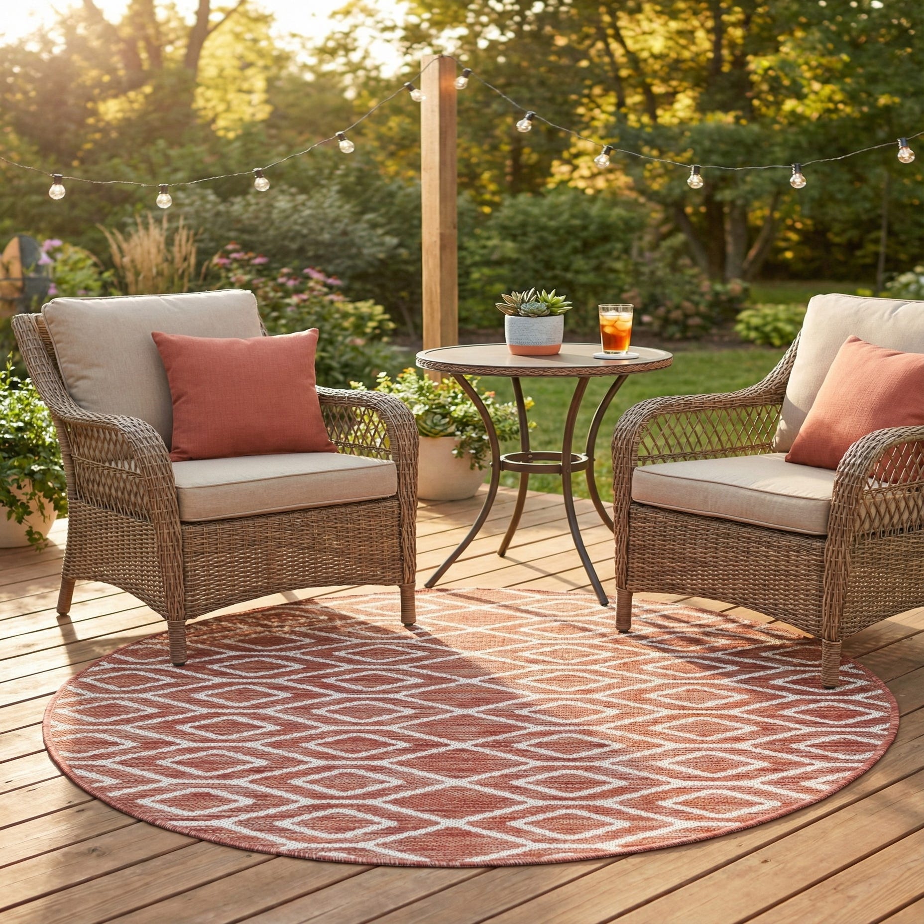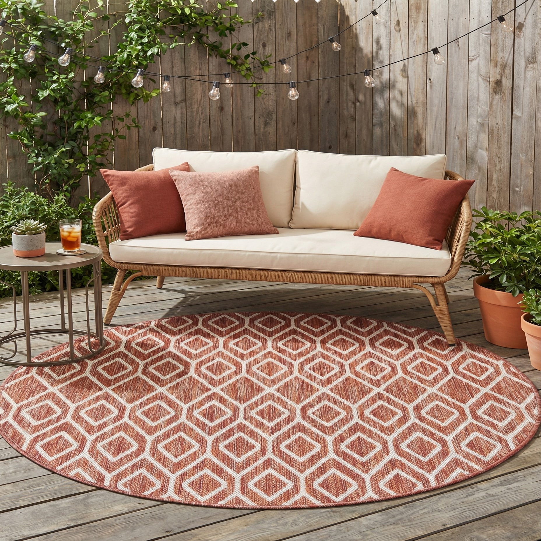 A 4' round Jill Zarin Outdoor rug featuring a modern trellis pattern in shades of orange and red, suitable for indoor/outdoor use.