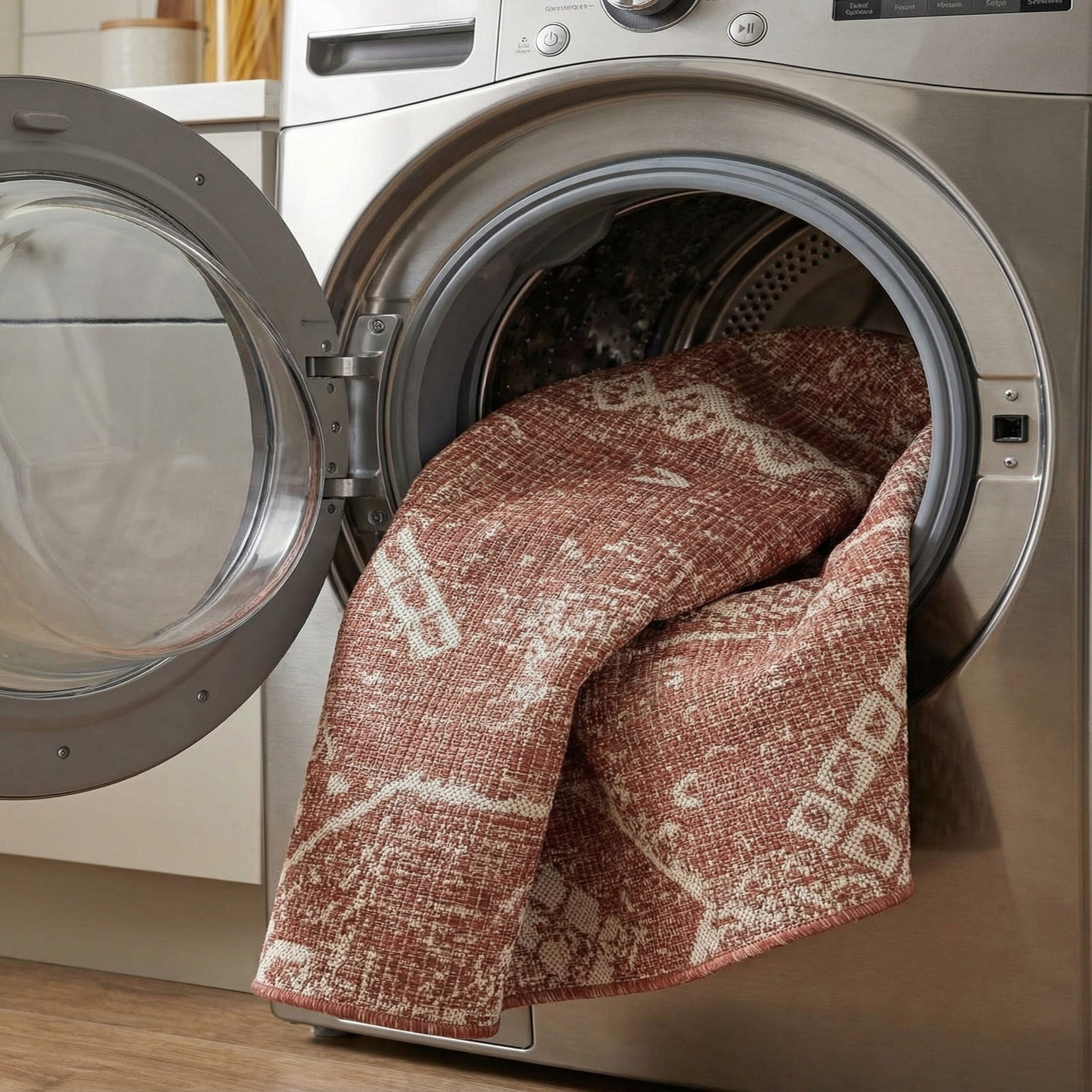 A rust red ground sets the stage for an ivory, tribal-inspired pattern that looks hand-worn and lived-in. The design blends linear medallion fragments, diamond chains and scattered motifs in an intentionally distressed layout that feels organic rather than precise. Machine-made from 100% polypropylene, the rug has a low-profile, tightly woven texture you can feel underfoot — a slightly ribbed, flat surface that reads tactile and layered.