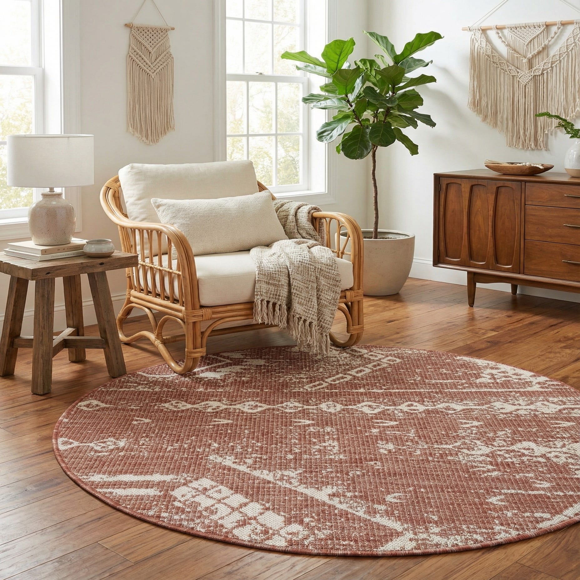 A 4' round orange and red outdoor rug with a distressed traditional and modern pattern, ideal for a patio.