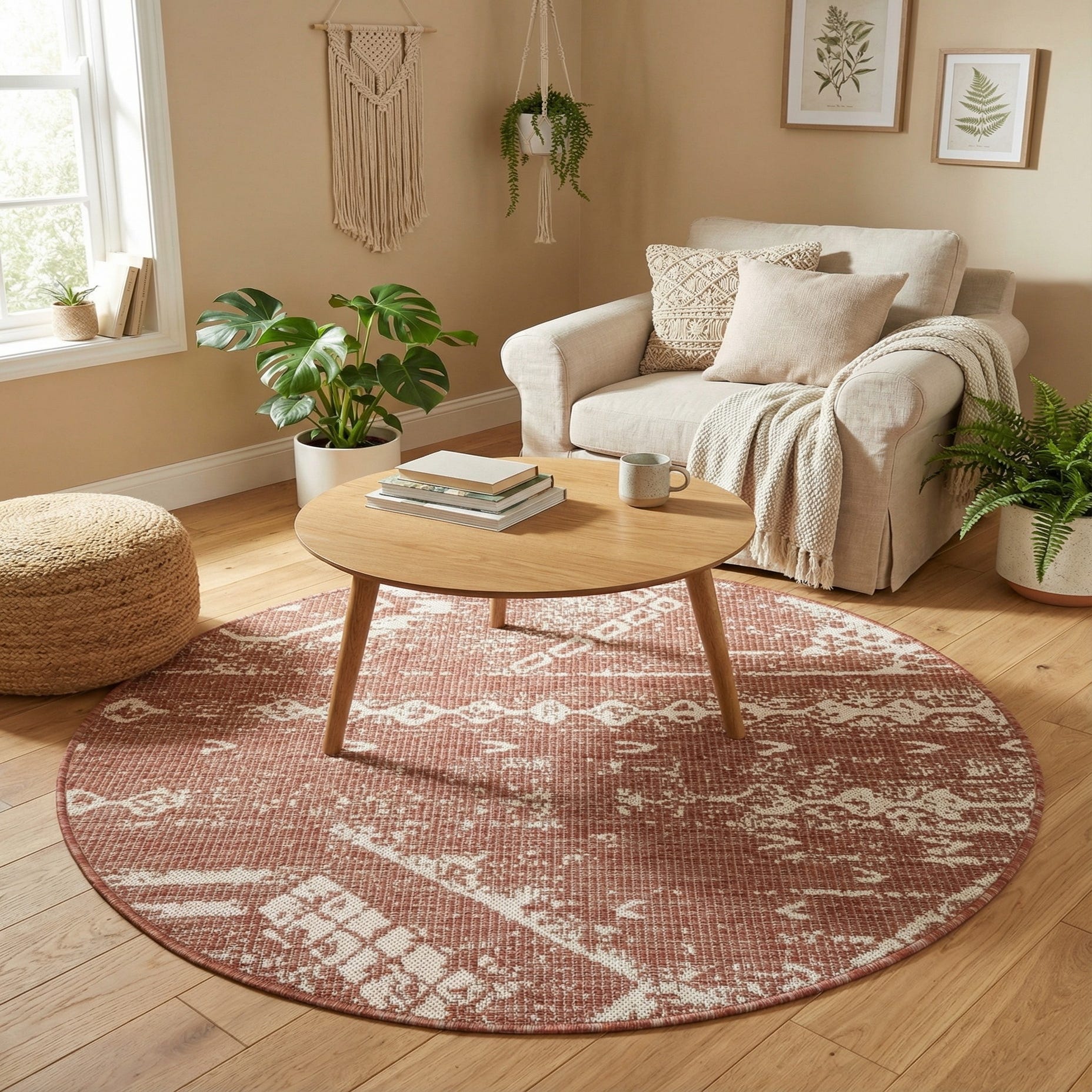 This round piece is ideal for creating a focal point under a bistro table or anchoring a cozy conversation nook on a covered patio or sunroom. It pairs naturally with warm woods, rattan or wicker seating, neutral linens and terracotta planters, and complements bohemian, coastal-modern or eclectic interiors when layered with natural-fiber rugs or simple wood furniture.
