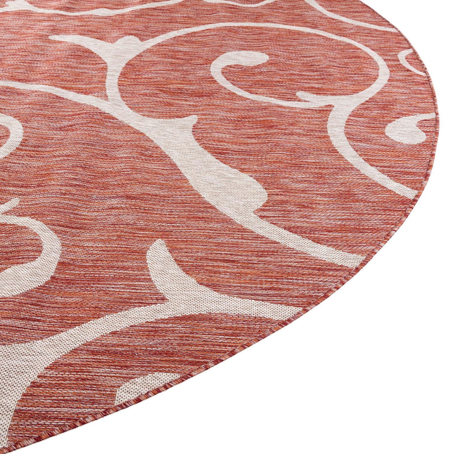 A 4' round orange and red rug with a white botanical scroll pattern, suitable for indoor or outdoor use.