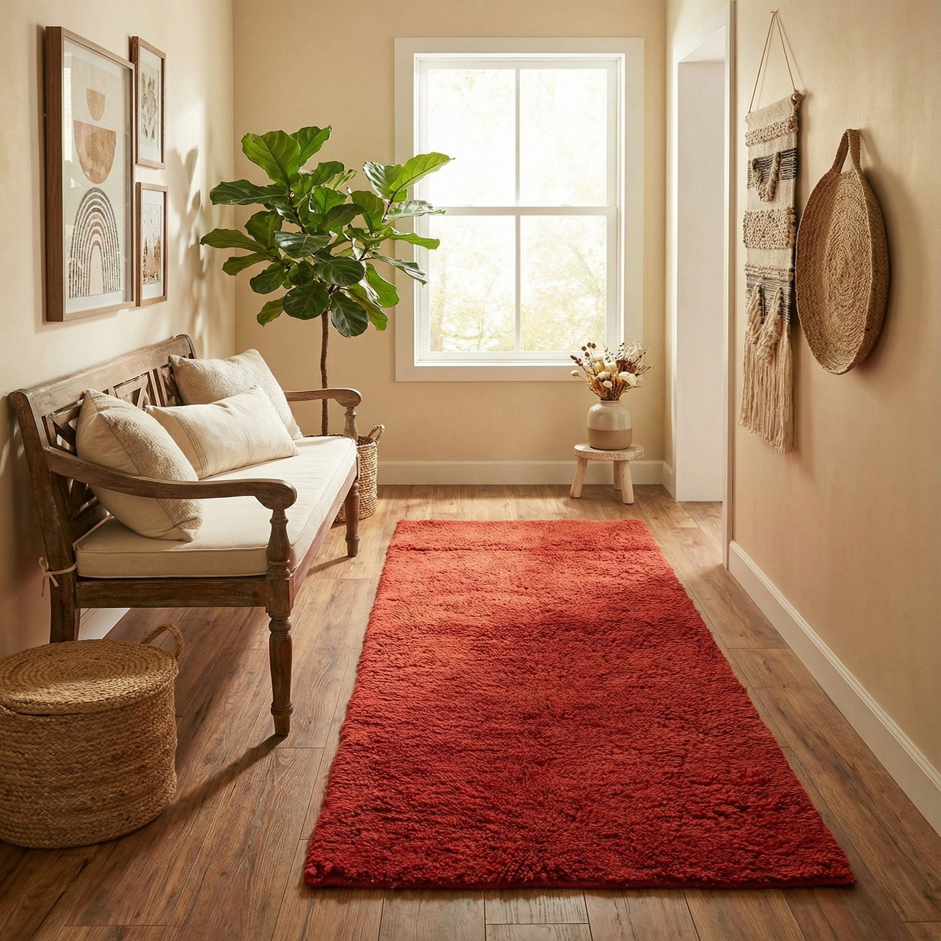 A plush, handmade 4 ft runner rug in a vibrant orange-red shag texture, perfect for a hallway.