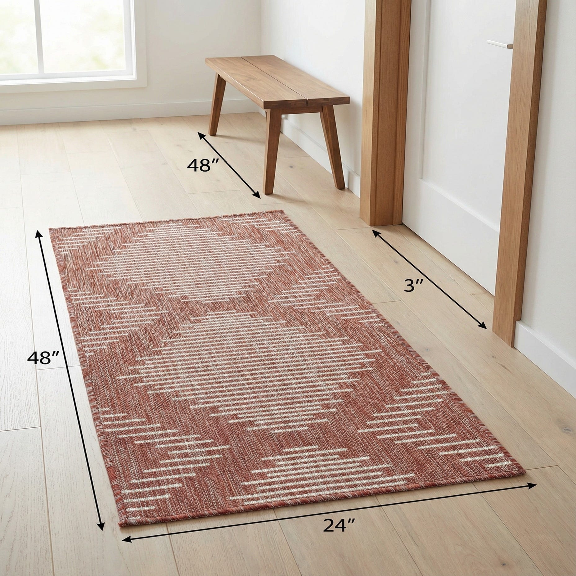 This Outdoor Modern collection 4 Ft Runner rug presents a harmonious blend of practicality and contemporary appeal. The piece showcases a geometric pattern with a dynamic diamond motif that exudes a sense of movement, and the rust-red background color is accented with lighter hues to create visual interest. Its machine-woven construction from 100% polypropylene imparts durability and a texture that's conducive to high-traffic areas.