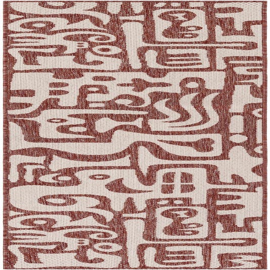 A 4 ft runner rug from the Outdoor Modern collection, featuring an abstract pattern in varying shades of orange and red.