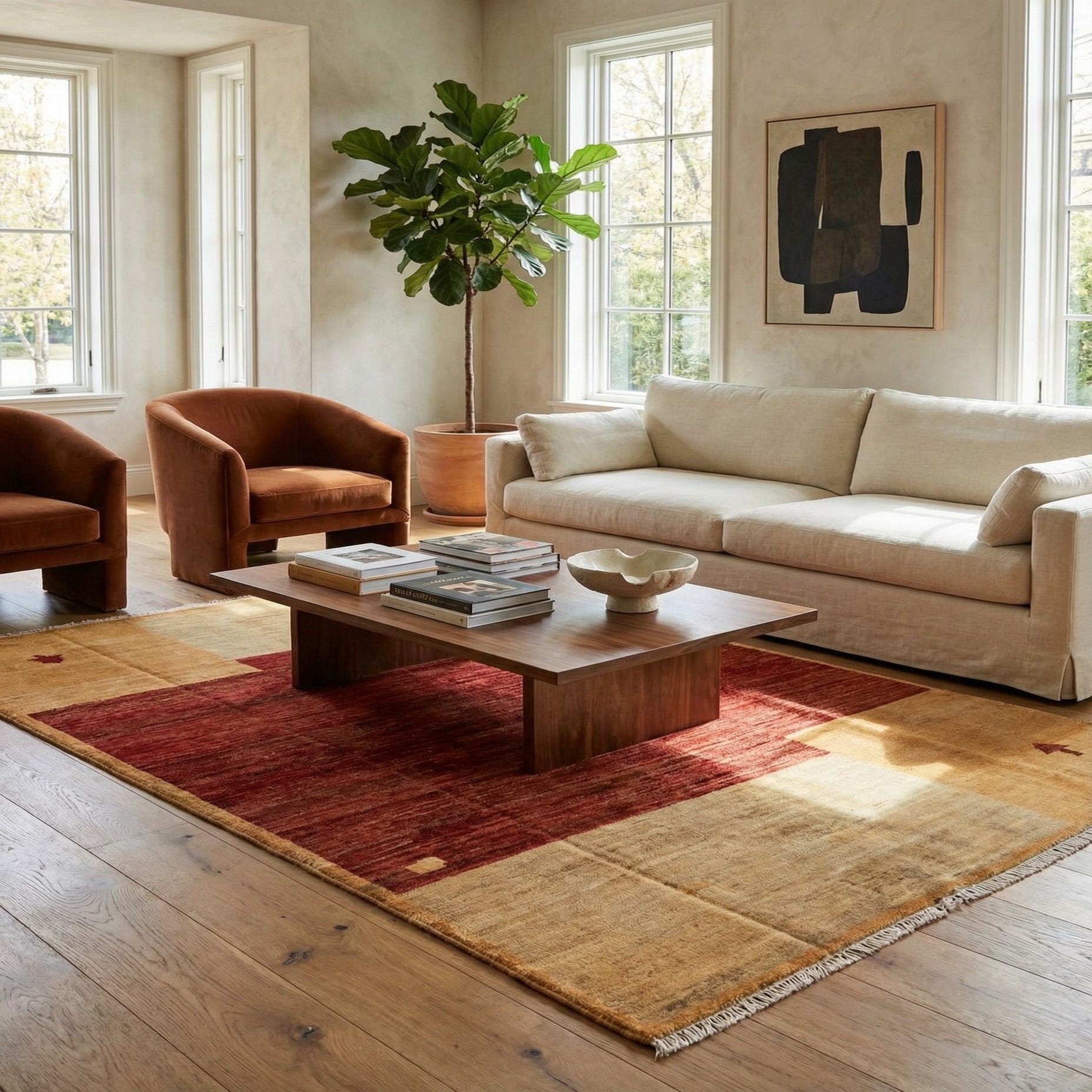 A 4x6 rectangular Kashkuli Gabbeh rug featuring a modern abstract design in oranges and reds, handmade from wool.