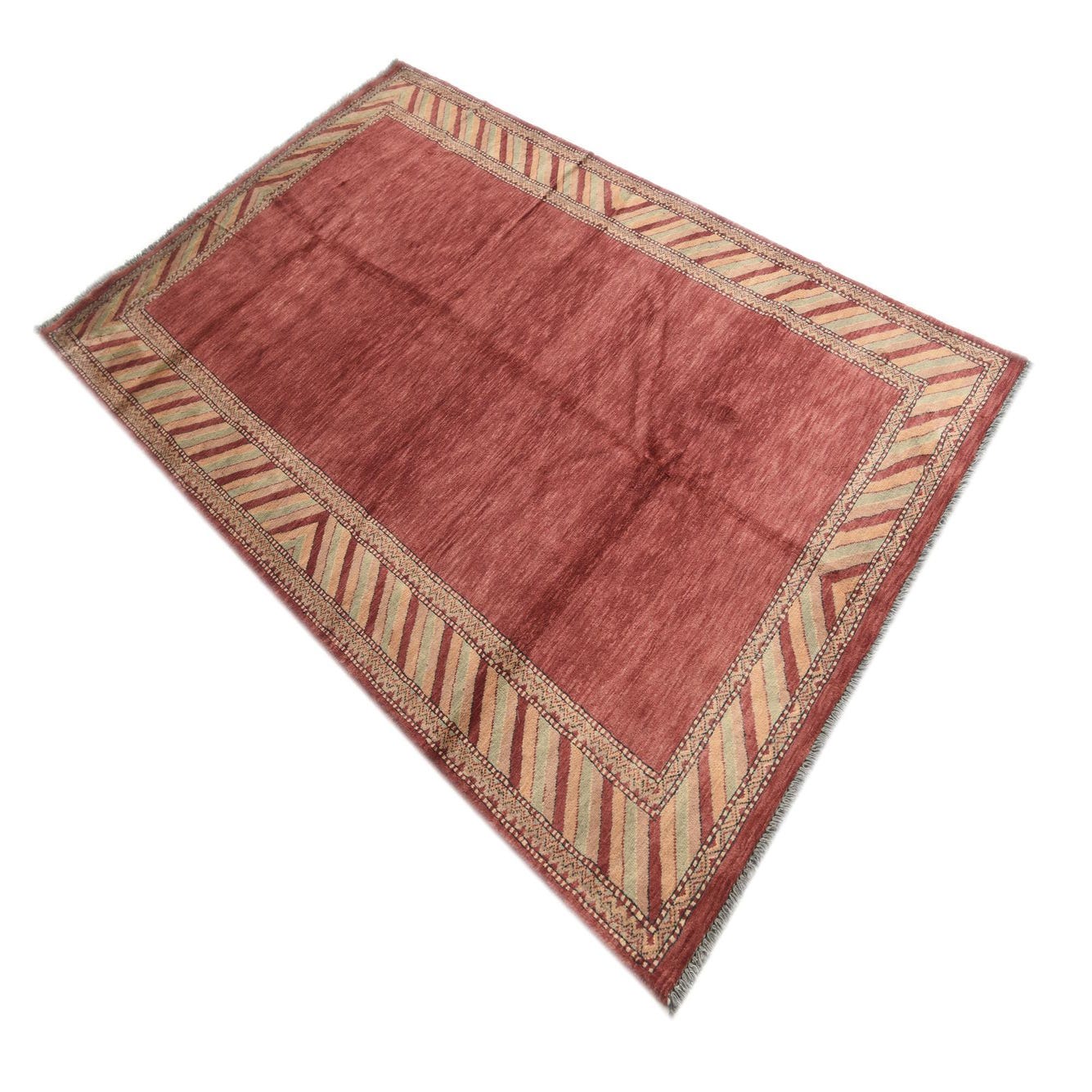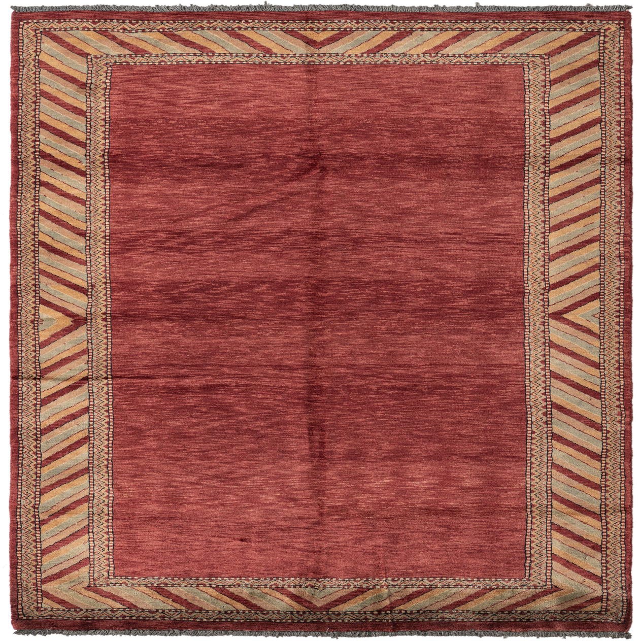 This hand-knotted rug from the Kashkuli Gabbeh collection features a robust rust red background harmoniously complemented by a border incorporating ivory, light blue, and beige hues. The rug measures 4x6 feet and is crafted of 100% wool, which lends a naturally resilient and textured feel to the piece. Its pattern is understated yet distinct, with a decorative border design that frames the rug's solid center. Additionally, the fringe detailing adds a traditional touch to its overall aesthetic.