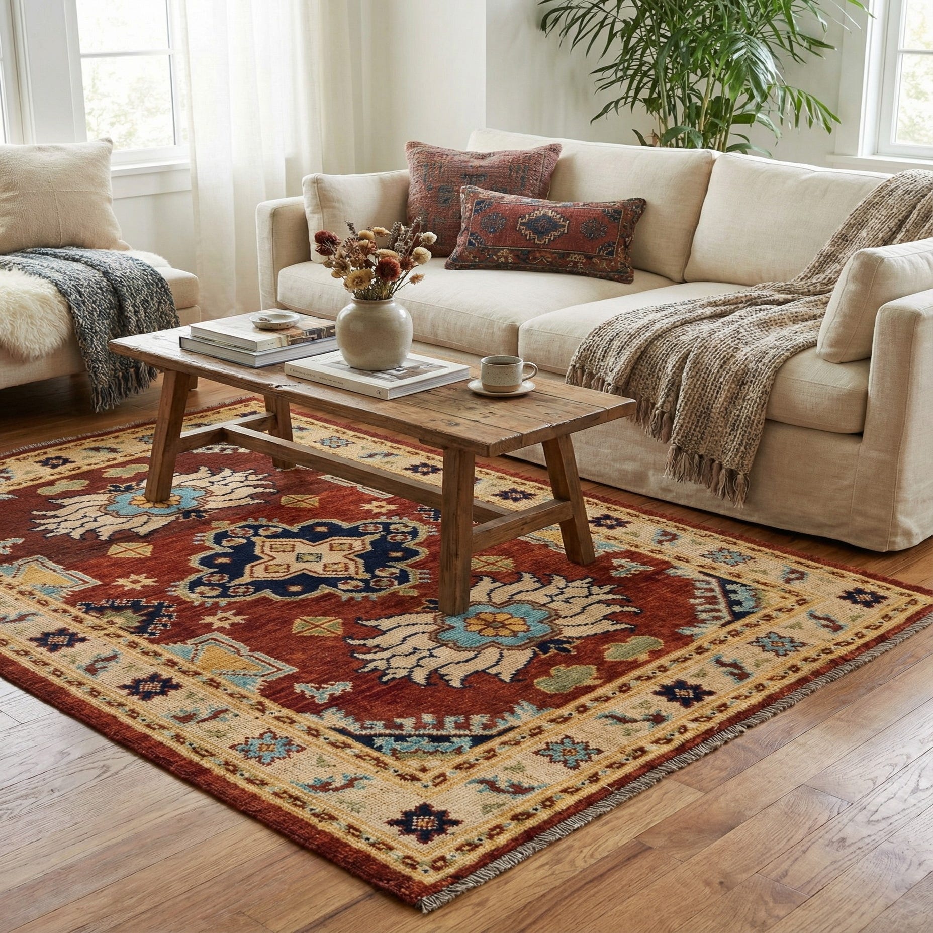 The Kazak Collection presents a sophisticated 4x6 hand-knotted rug crafted from 100% hand-spun wool, offering both durability and tactile appeal. Showcasing a bold rust red background, this piece is enlivened with a symmetrical arrangement of traditional geometric and botanical motifs in a vivid palette that includes blue, ivory, navy blue, light green, and yellow. The intricate designs are bordered by a complementary series of smaller patterns, accented by a refined fringe, which adds to the rug's textural dimension and visual interest.