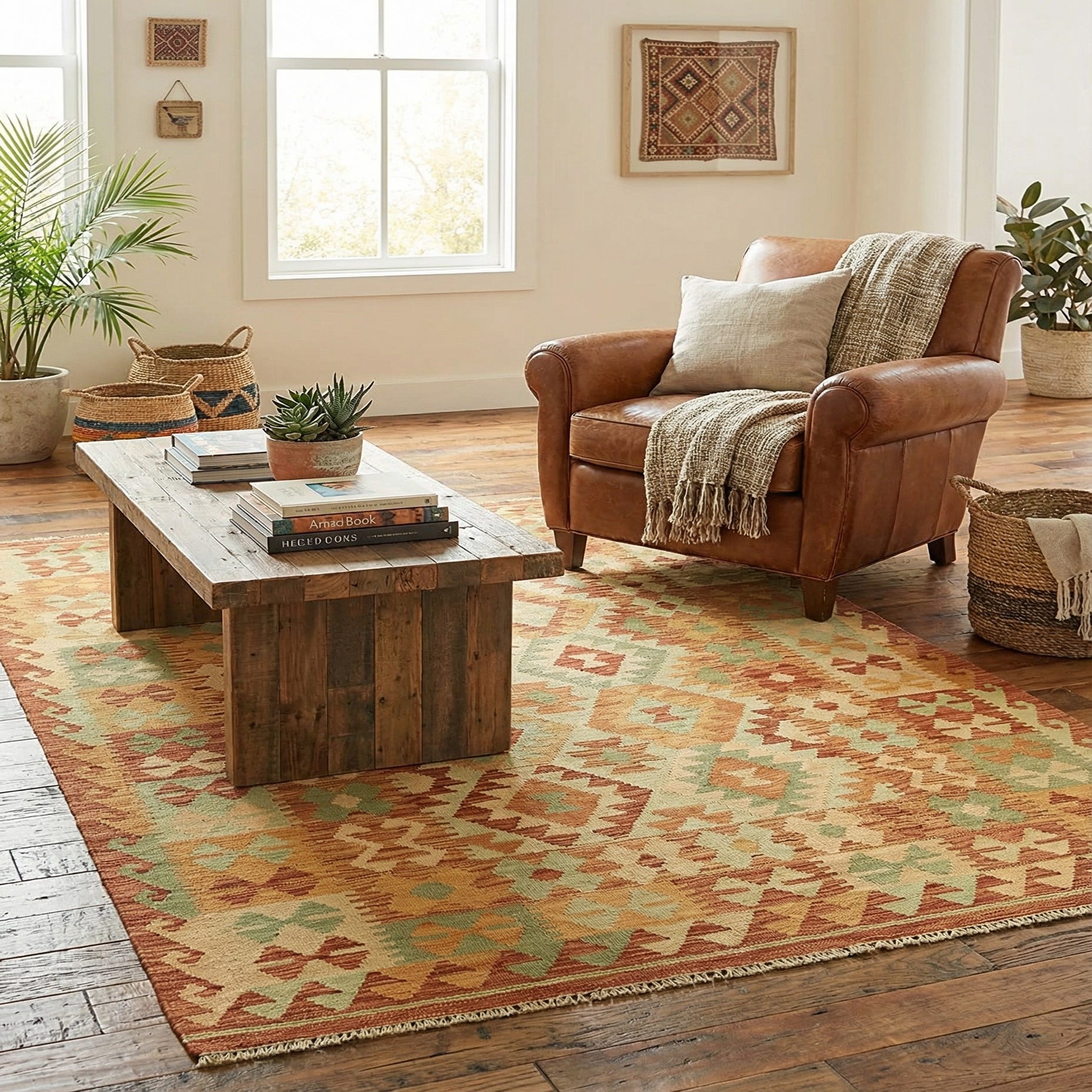 A 4x6 rectangular Kilim Waziri rug featuring a traditional tribal pattern in shades of orange, red, and cream.
