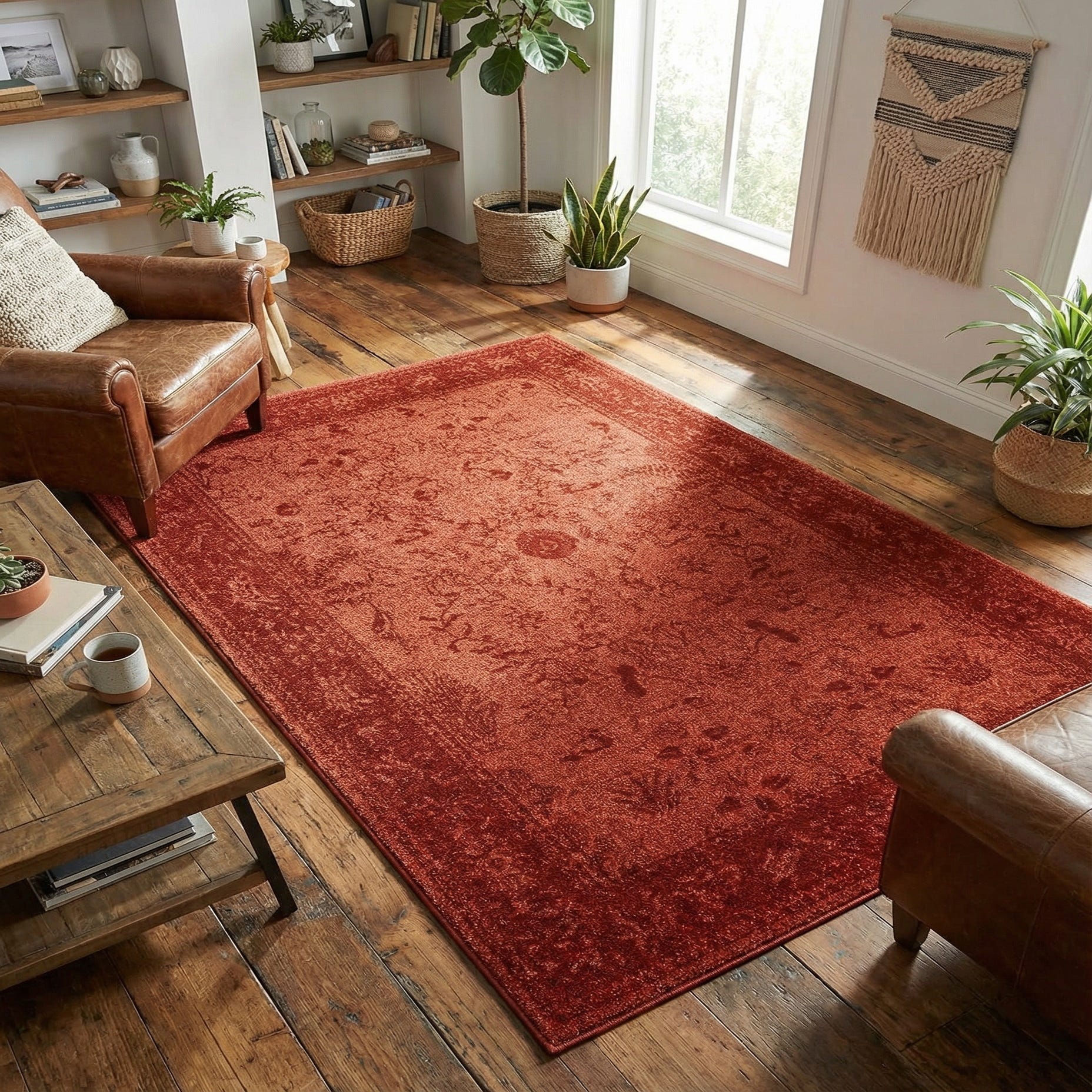 Primary color is Rust Red. Colors in this rug include: Rust Red, Orange, Terracotta.