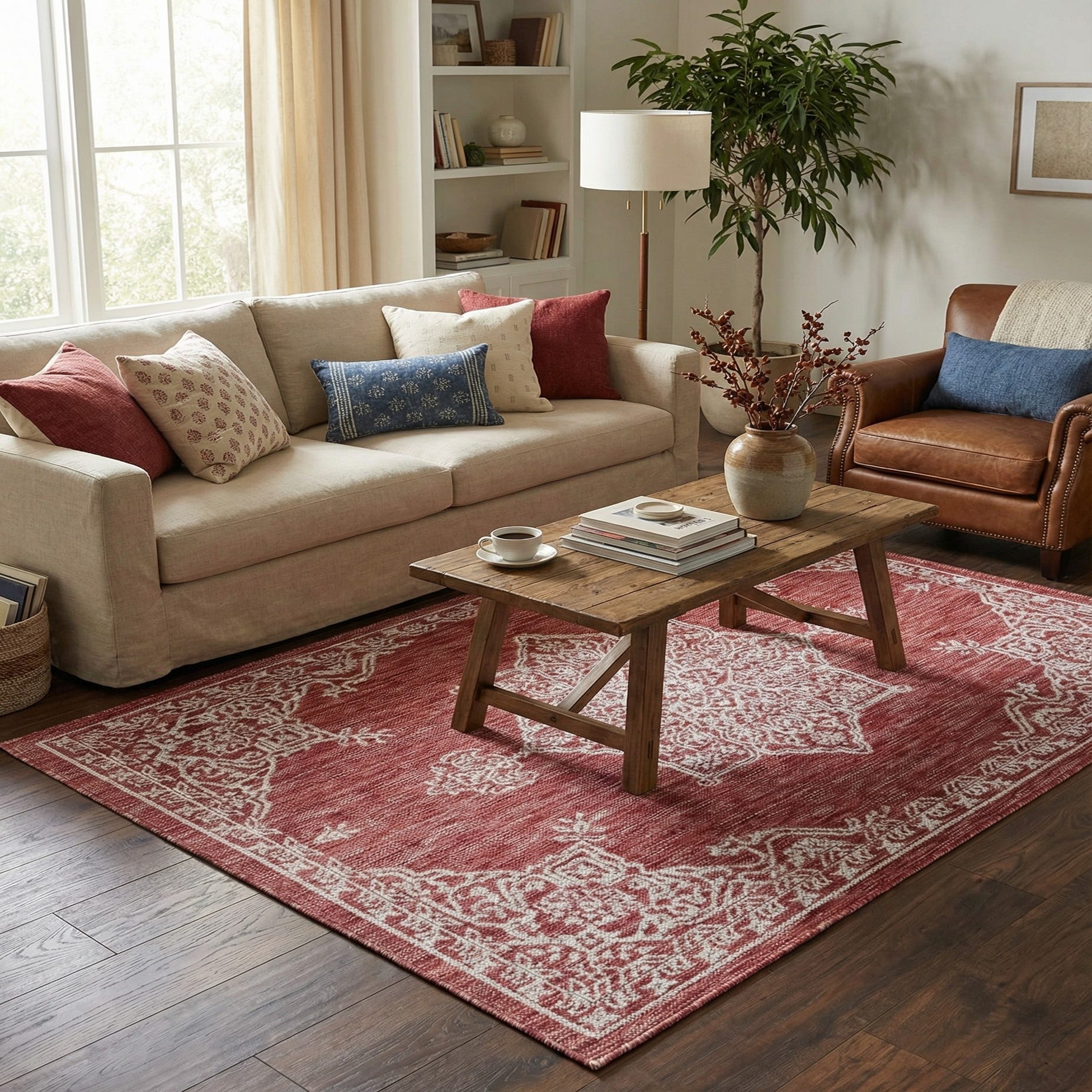 This rug works well on a covered patio or sunroom as an anchor for seating, or inside as an entryway or dining accent to bring warm color without overwhelming a space. Pair it with natural wood furniture and neutral linens for a relaxed traditional look, or mix it with matte black metal and textured throws for a modern-transitional approach. Its low pile makes it easy to layer under a small table or in a high-traffic zone where you want pattern and color that endure.