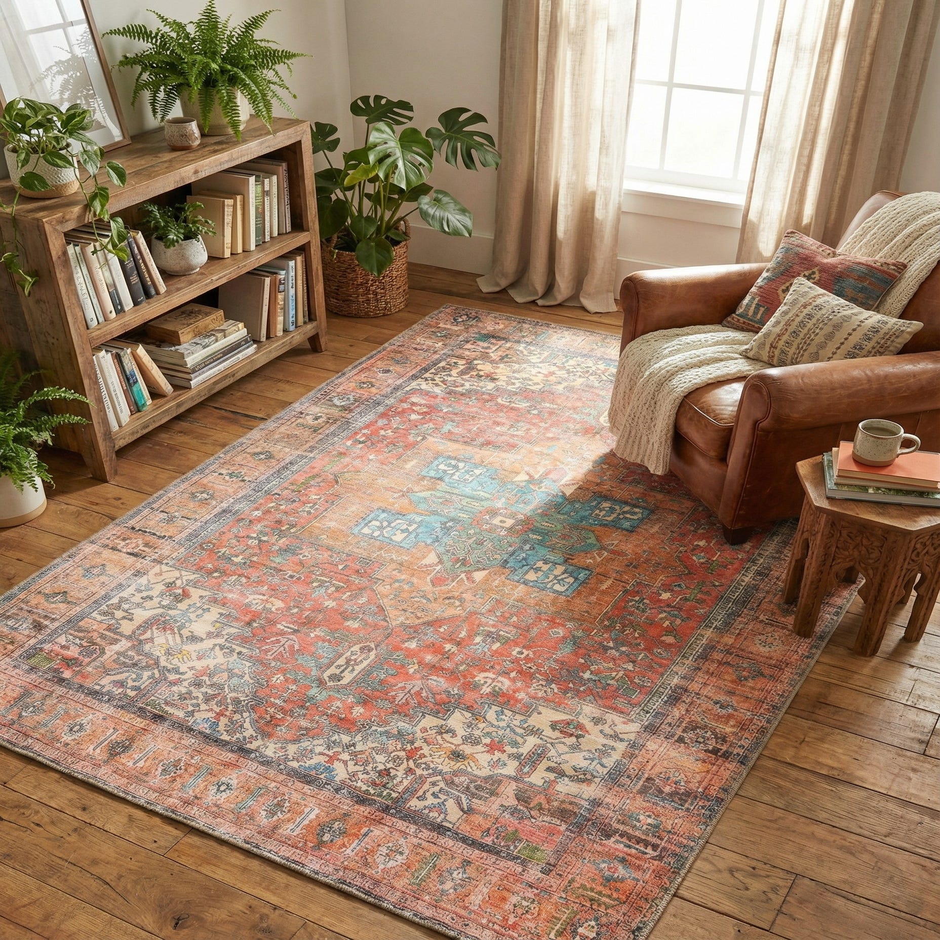A heritage-inspired medallion design sits on a warm rust red ground, where layered floral and geometric motifs unfold in faded, vintage-style detail. A central turquoise-blue and green medallion anchors the composition, while beige, black, yellow, violet and blue accents weave through the field and borders. The pattern has an intentionally weathered look that highlights fine motif work and gives the rug a lived-in, collected character.