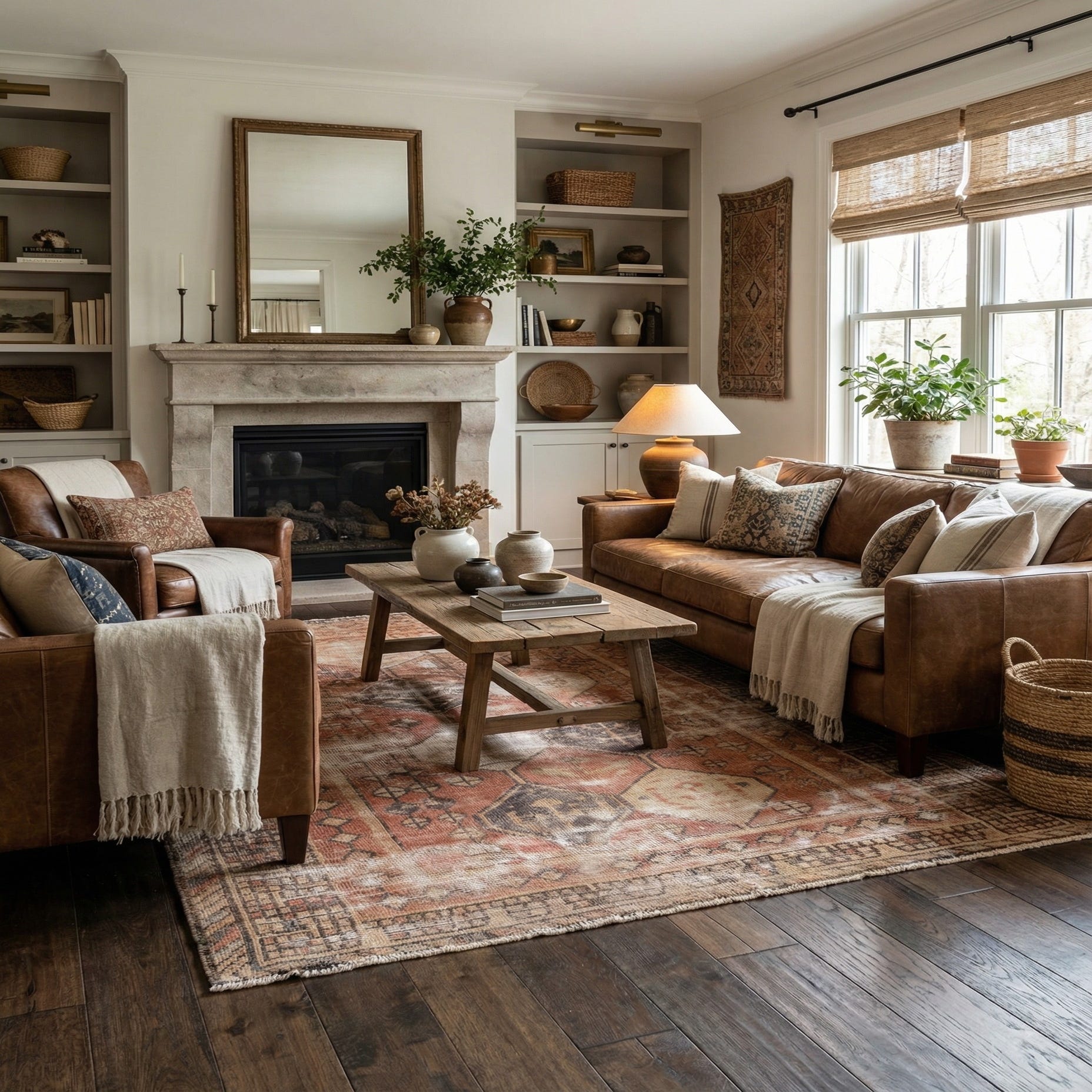 The rug's fringe adds a classic finish to the piece, enhancing its overall visual appeal. This rug would effortlessly complement spaces that embrace a vintage or eclectic aesthetic, such as a cozy reading nook, a warm living room, or even an artist's studio. It could also serve as a striking anchor piece in a more contemporary setting, providing a rich contrast to modern furniture and décor. Additionally, its warm and inviting palette makes it well-suited for spaces that aim to create a comfortable and inviting atmosphere.