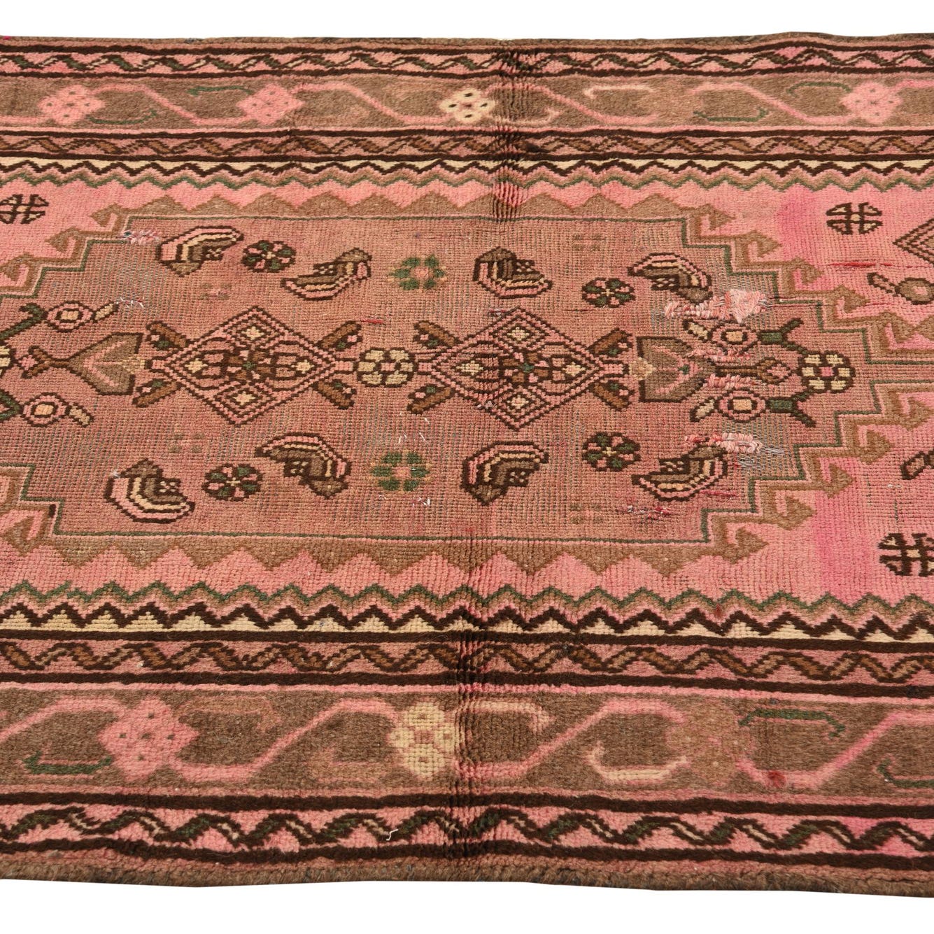 This rug, with its semi-antique status (40-60 years old), carries a sense of heritage and timeless elegance. The condition bears witness to its history, showing areas of repair and low pile which contribute to its authentic character. The presence of fringe along the edges adds a classic touch.